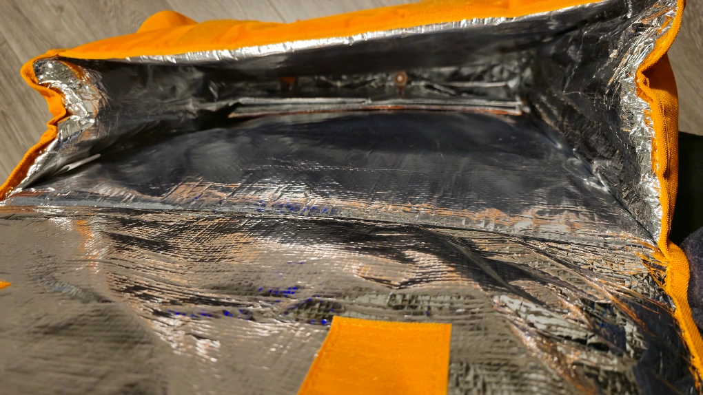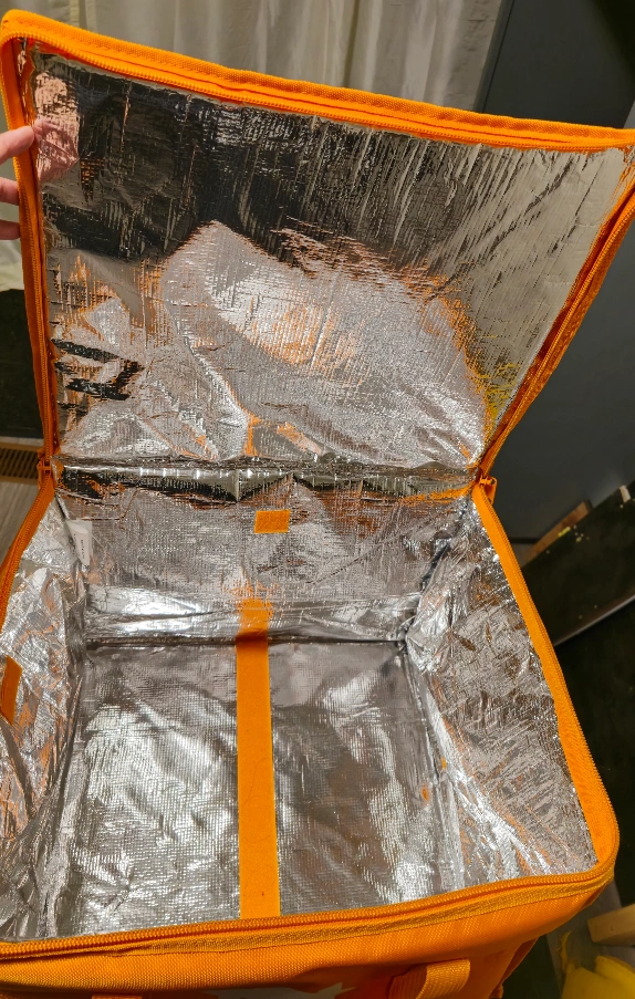Large orange insulated bag with two handles, zipper closure, and silver reflective lining. Perfect for keeping food warm or cold. It is not use, it was kept in the storage for awhile