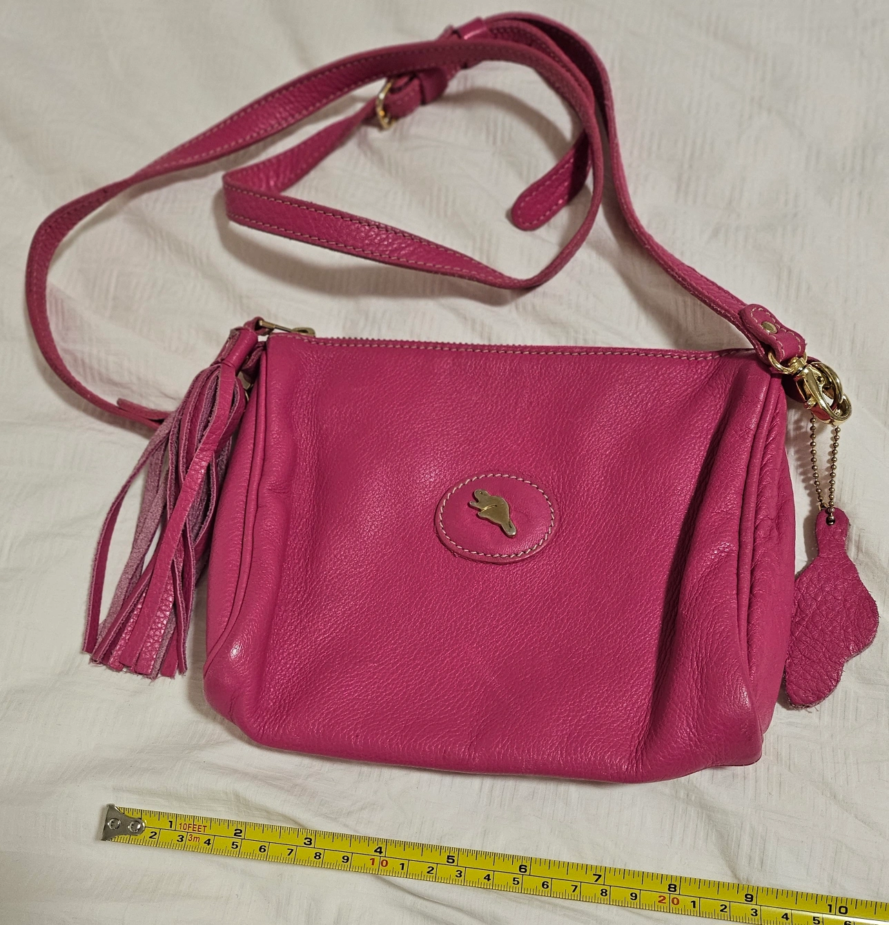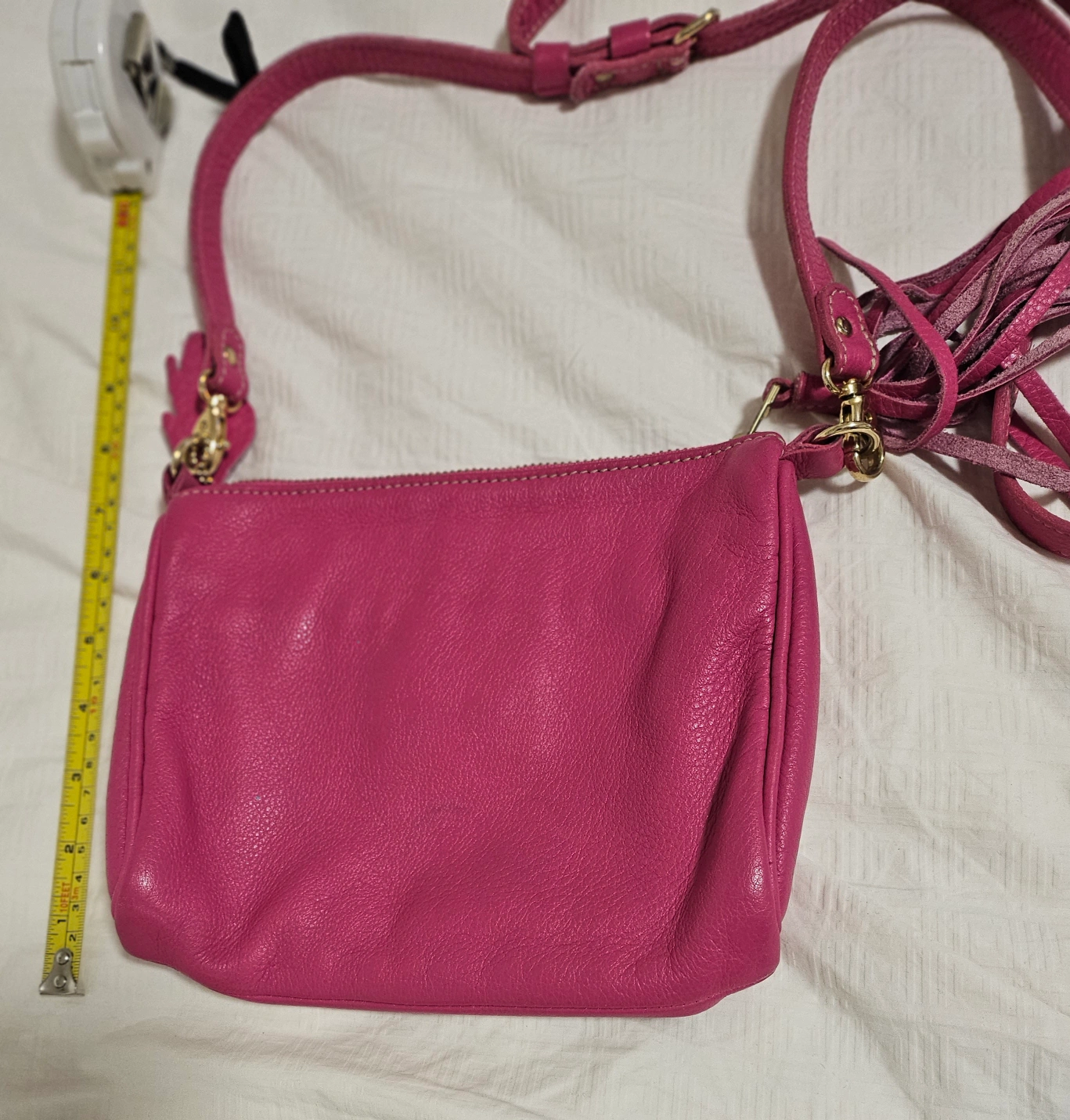 Small pink leather crossbody bag with a tassel. Features a zipper closure, and gold hardware.