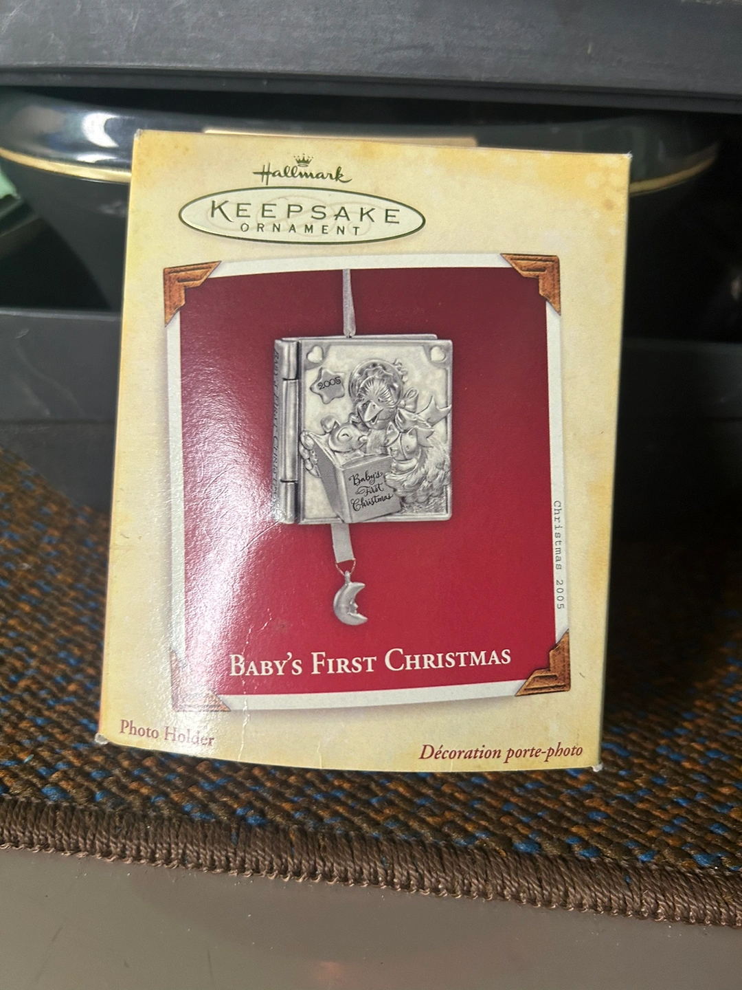 Hallmark ornament in the shape of a book with an angel and babies on the cover. The book opens to hold a photo. Includes a crescent moon hanging from the bottom.