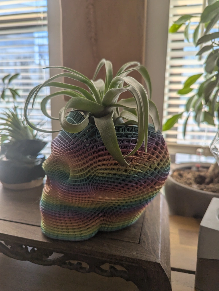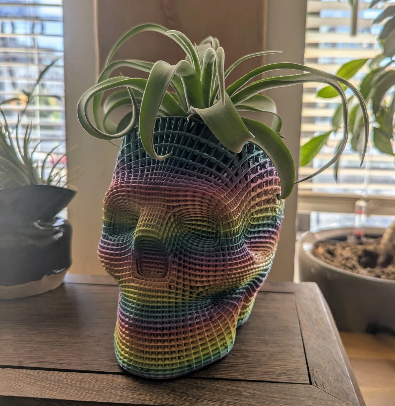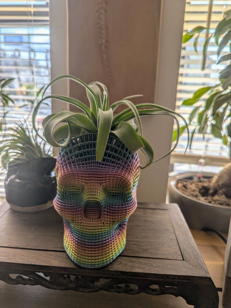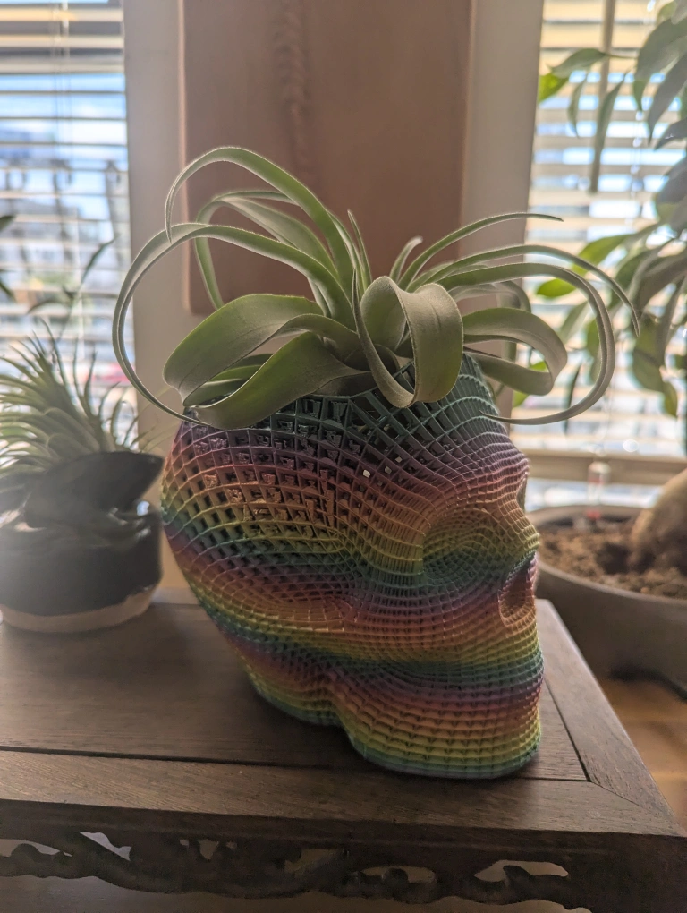 This is a rainbow skull planter with a live air plant.