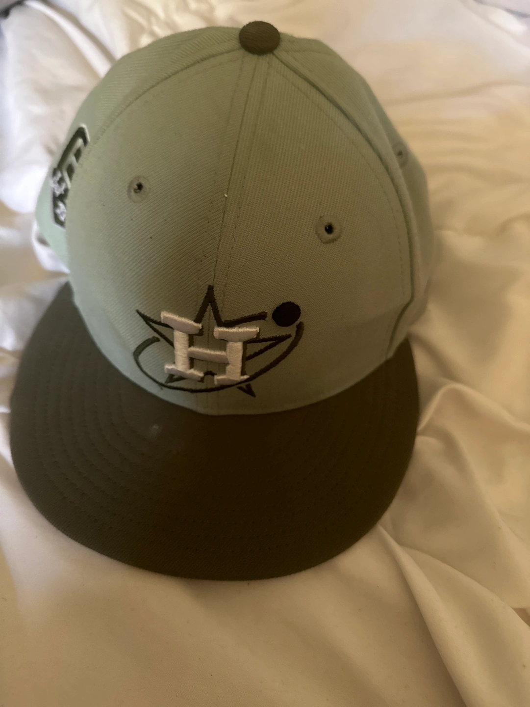 A green Houston Astros New Era hat. The hat has a green brim and a green crown. It has a white "H" with a star and a circle around it. There is a New Era logo on the side.