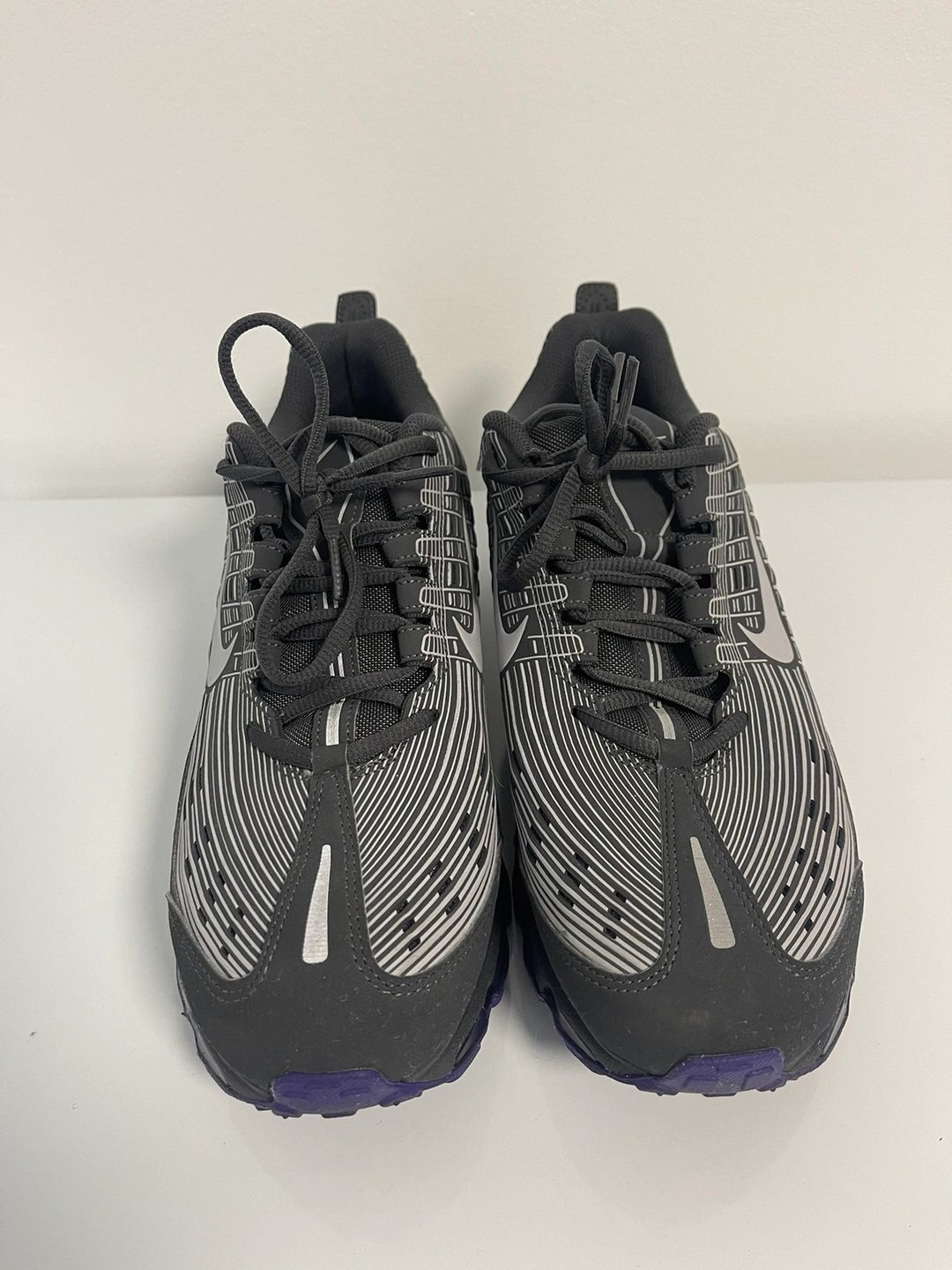 Men's Nike running shoes in grey and black. They have purple accents and a mesh upper. These shoes are great for running or casual wear.