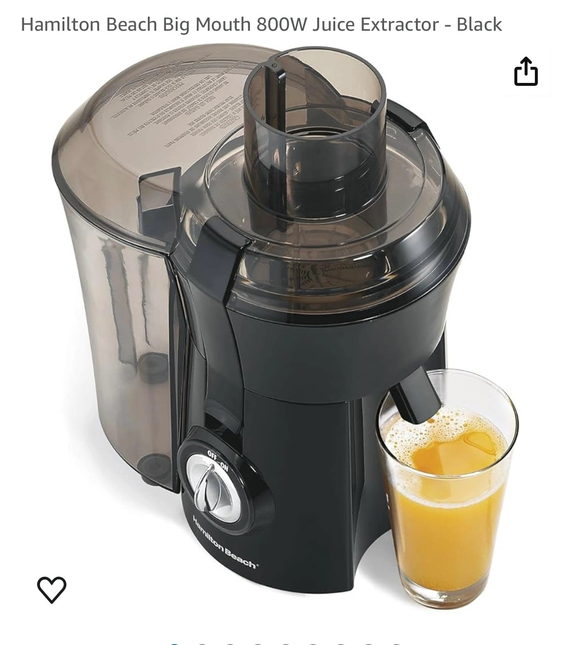 Enjoying fresh, healthy juice has never been easier. With its extra-large 3" chute, powerful motor, and simple controls, the Hamilton Beach Big Mouth 800W Juice Extractor quickly transforms whole fruits and vegetables into nutritious juice in seconds. The powerful motor ensures maximum juice yield for less waste and more flavorful juice, and the simple on/off button is easy to use. The 3" Big Mouth chute lets you easily add whole foods to save time and effort in the kitchen. Fit whole apples, peeled oranges, or handfuls of kale. The stainless steel micromesh filter strains away pulp and seeds for smooth, nutritious juice every time. The extra-large pulp bin holds more pulp, requiring less frequent emptying, so you can juice longer without stopping. Juice everything from firm carrots and celery to delicate leafy greens. Also use the juicer to make soy, almond, or rice milk, or try one of the included drink recipes. The juice extractor is BPA free in food zones, has dishwasher safe parts, and includes a brush for cleaning the stainless steel strainer. Product Features: Make fresh, healthy juice in seconds Maximum juice yield with powerful 800W motor Simple controls: Juice with confidence Juice longer: Extra large pulp bin holds more pulp. Extra large, 3" chute fits whole foods to reduce prep time Easy-to-clean with dishwasher-safe parts