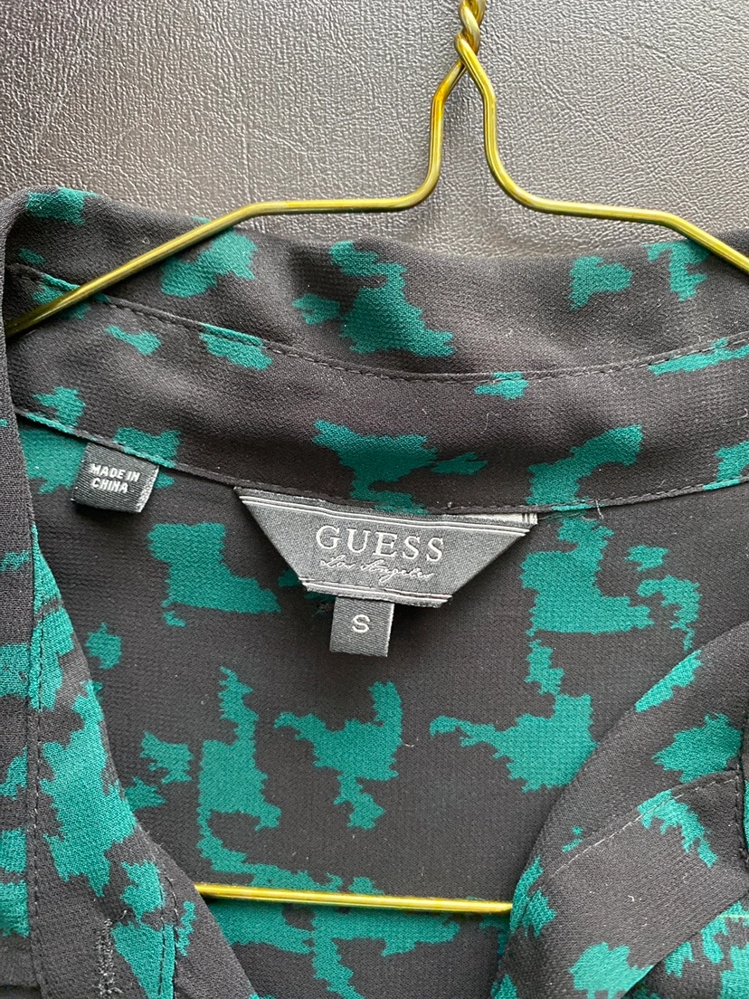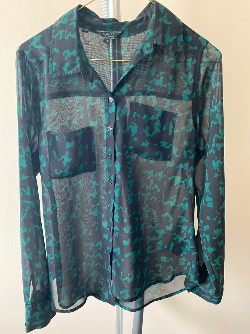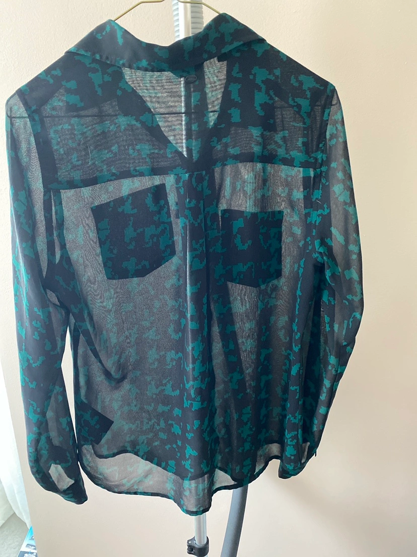 45Sheer, Long-sleeved, button-down blouse with a green and black patterned design. The blouse has two pockets. It is a size small. Like new. Pick up in Sundance.