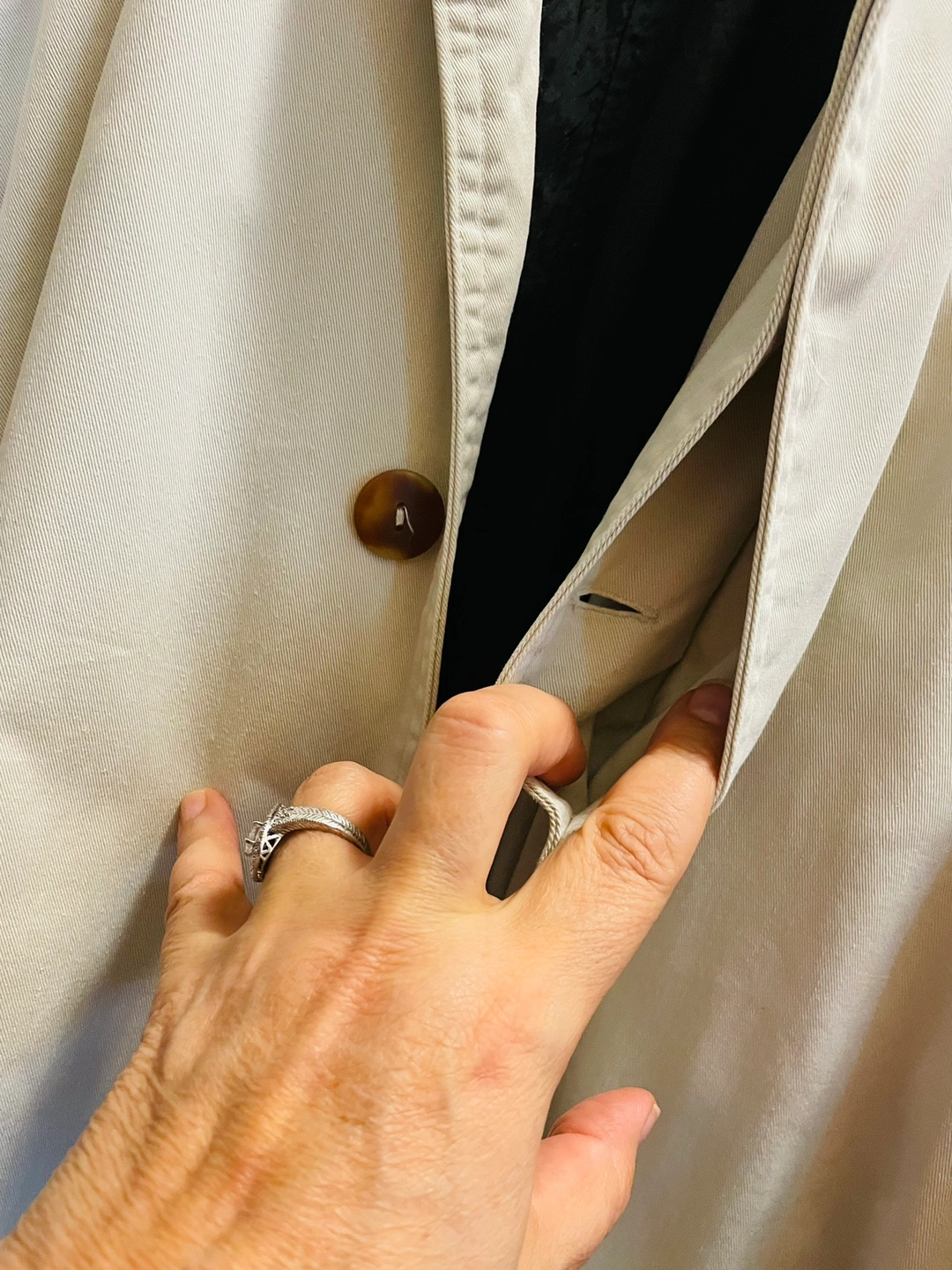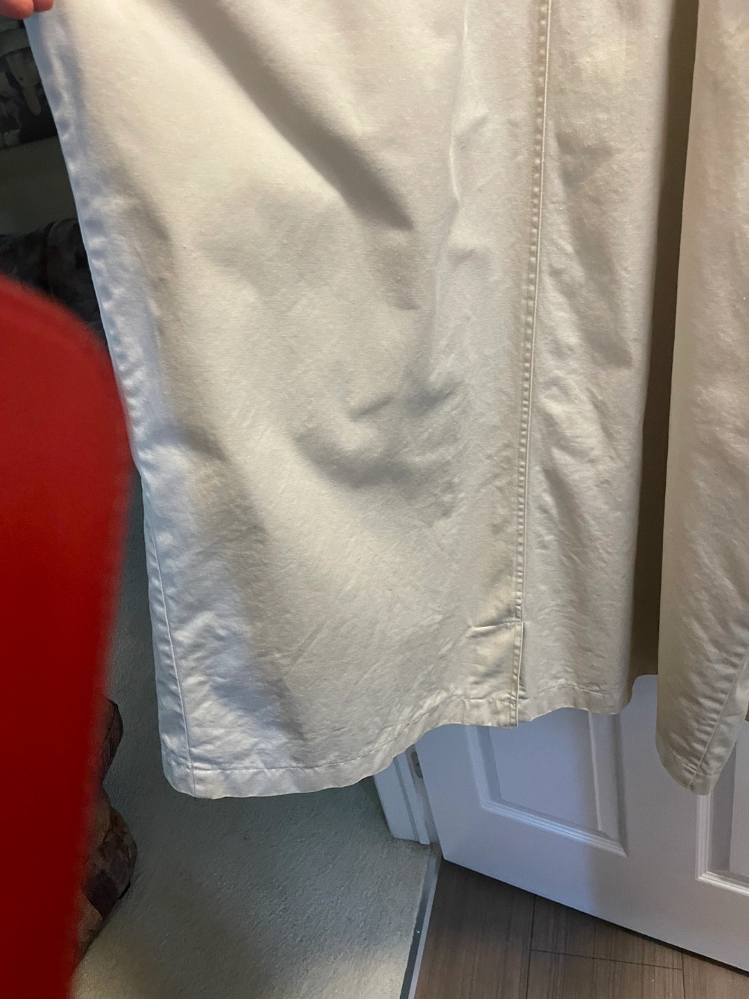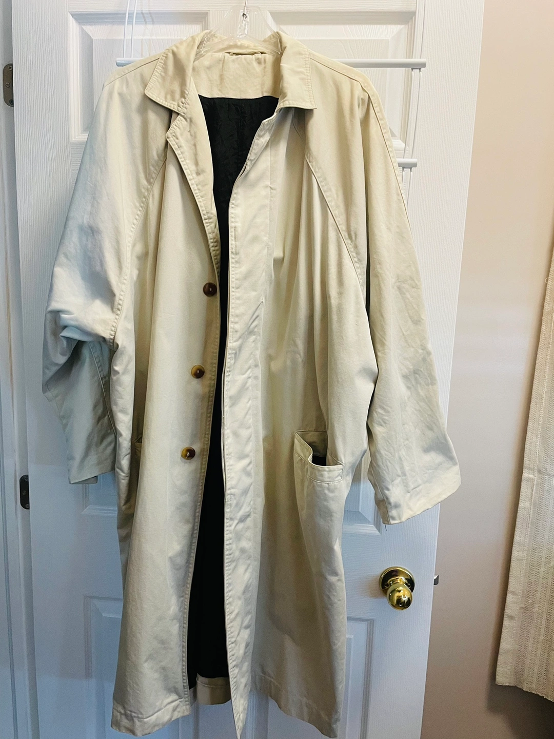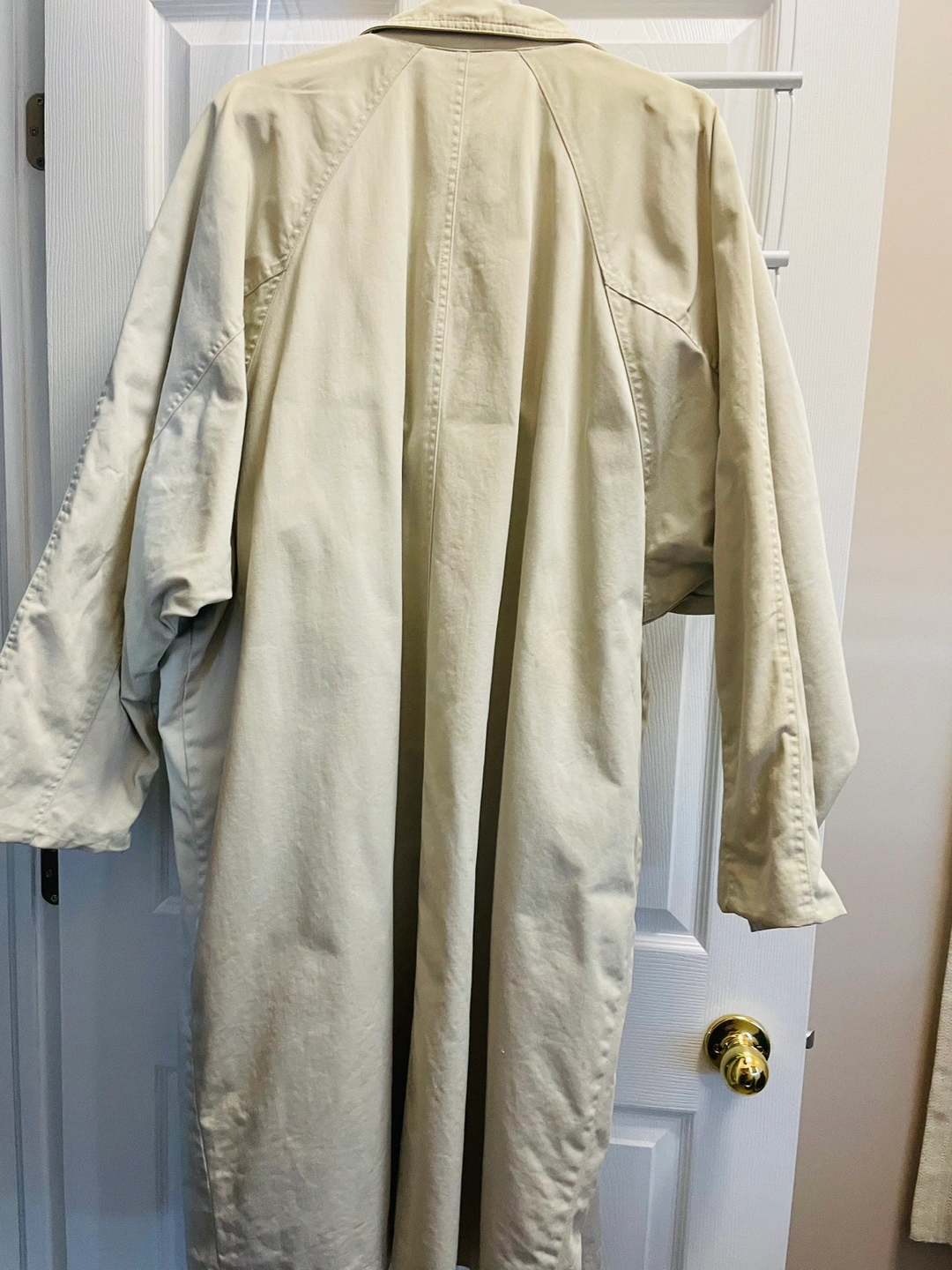 938100% Cotton trench coat with a black lining. It features a button closure and several pockets. Just washed for you. Belt is optional
