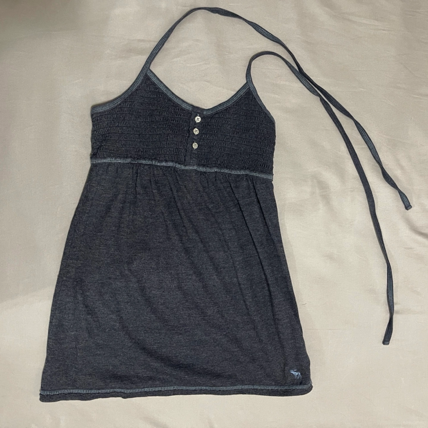 Gray halter top with a button up front and an Abercrombie logo on the bottom. It has a smocked bodice and a relaxed fit.