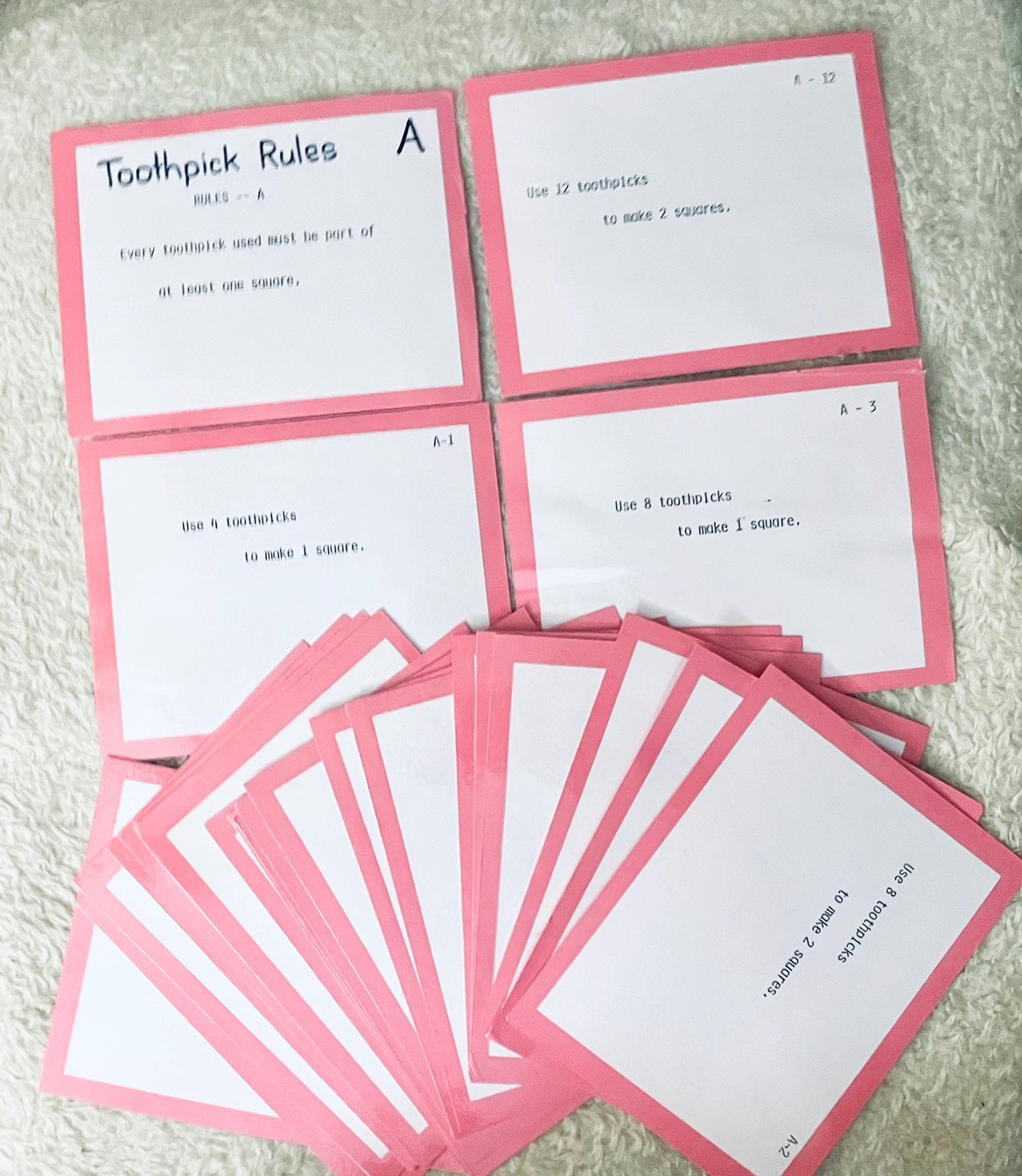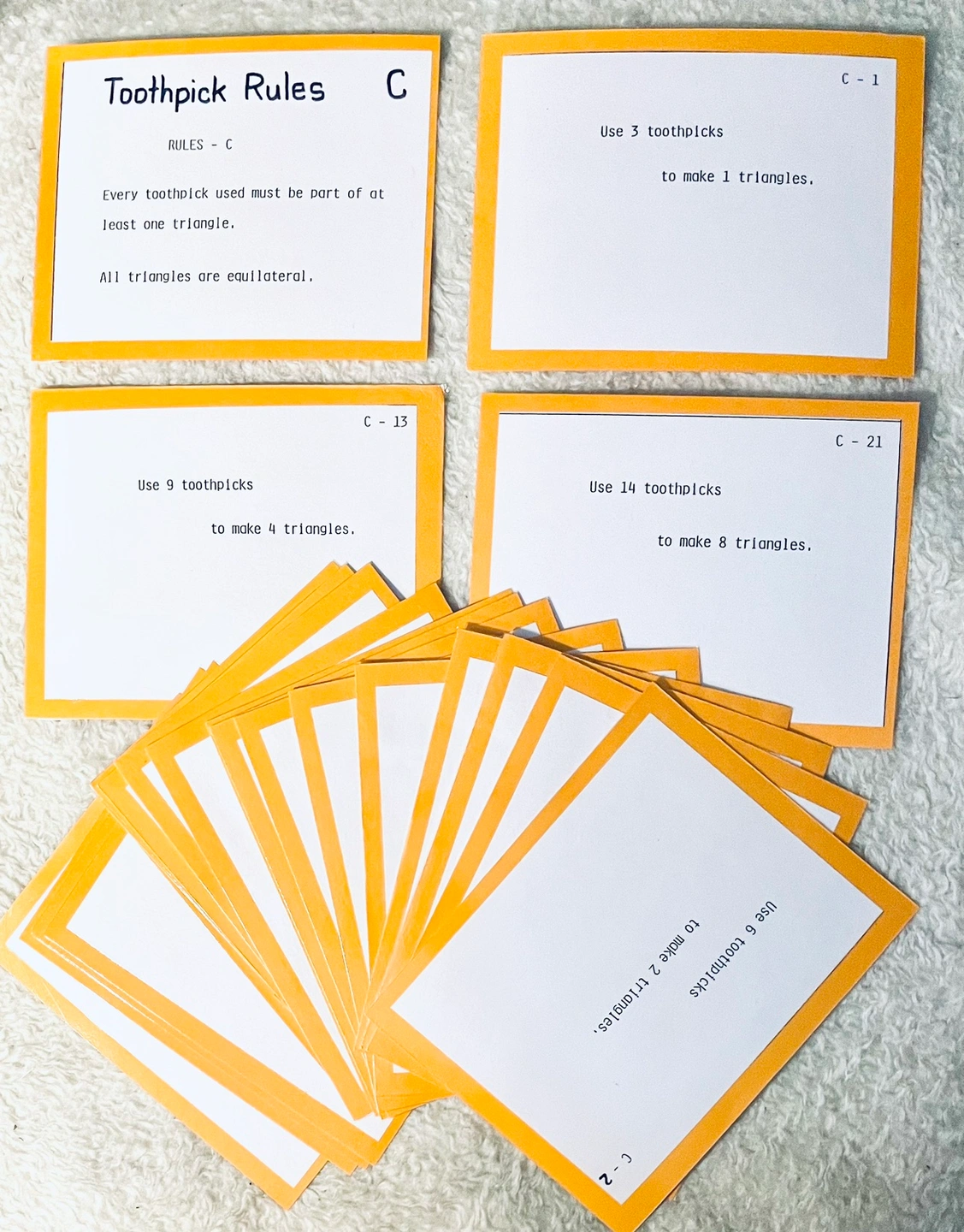Math - Toothpick Geometry Games is an educational higher learning problem solving game for kids to play independently or in a group or class to learn the geometrical properties of squares and triangles using toothpicks or popsicle sticks for younger kids.
