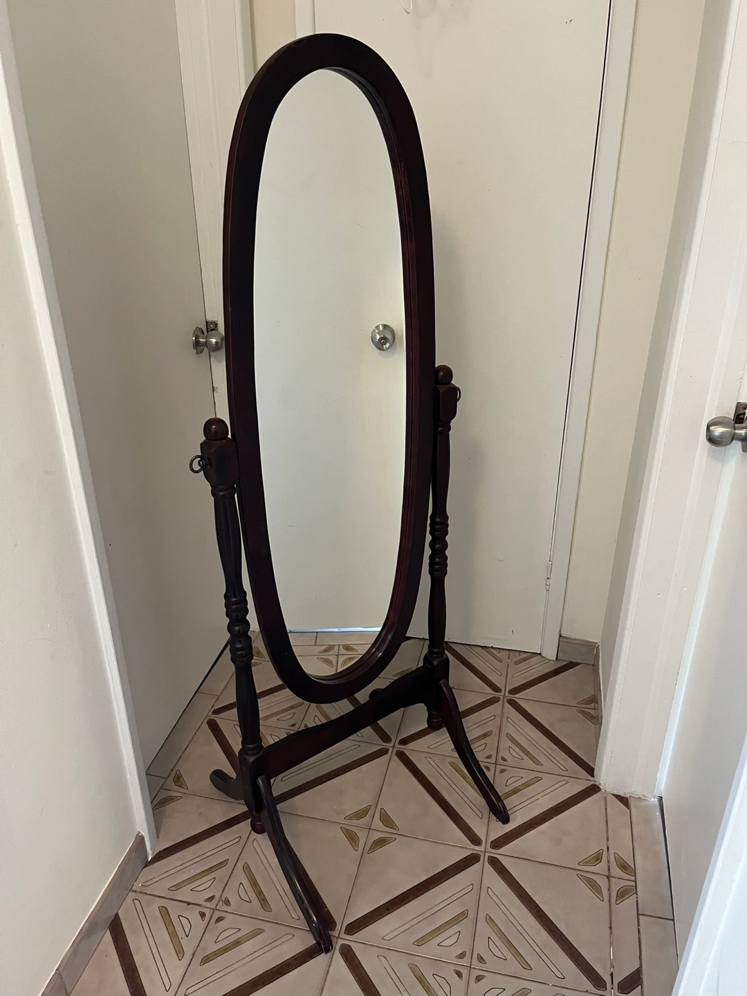 This is a large oval shaped full-length standing mirror with a dark wood frame. The mirror is on a stand with a decorative base.