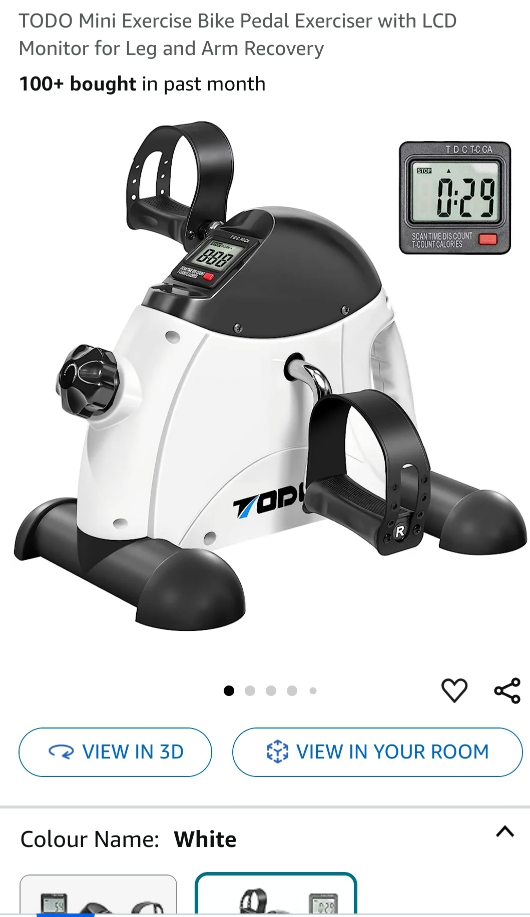 This is a mini exercise bike pedal exerciser. It is white with black accents. It includes an LCD monitor. It can be used for leg and arm recovery.