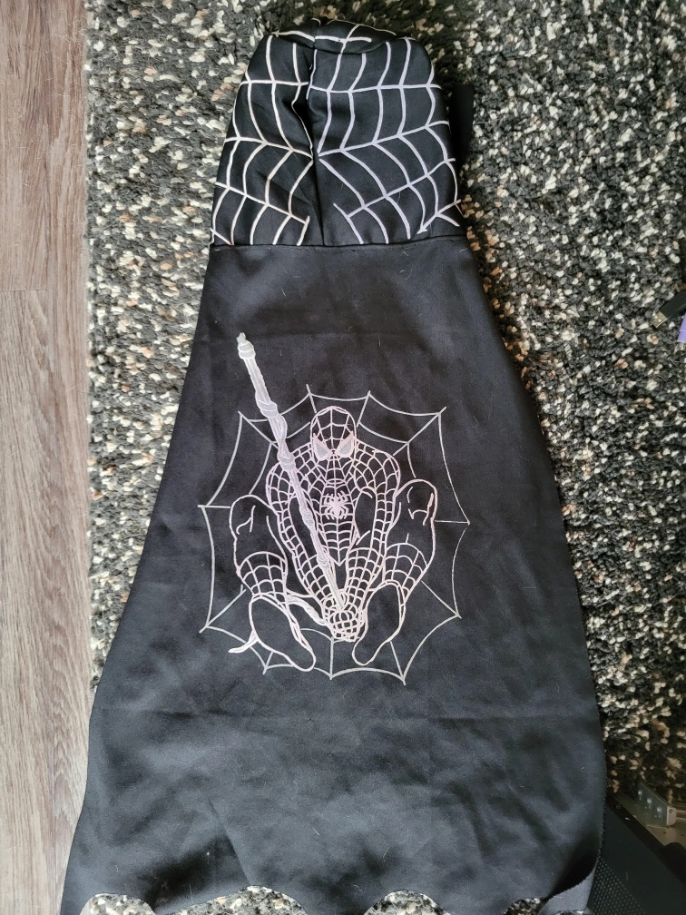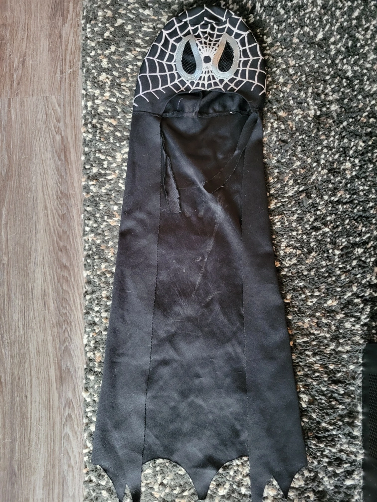 Black cape with a spiderweb and Spiderman design on the back. The cape has a hood with a spiderweb design on the front. It has a tie at the neck. it measures 34" long.