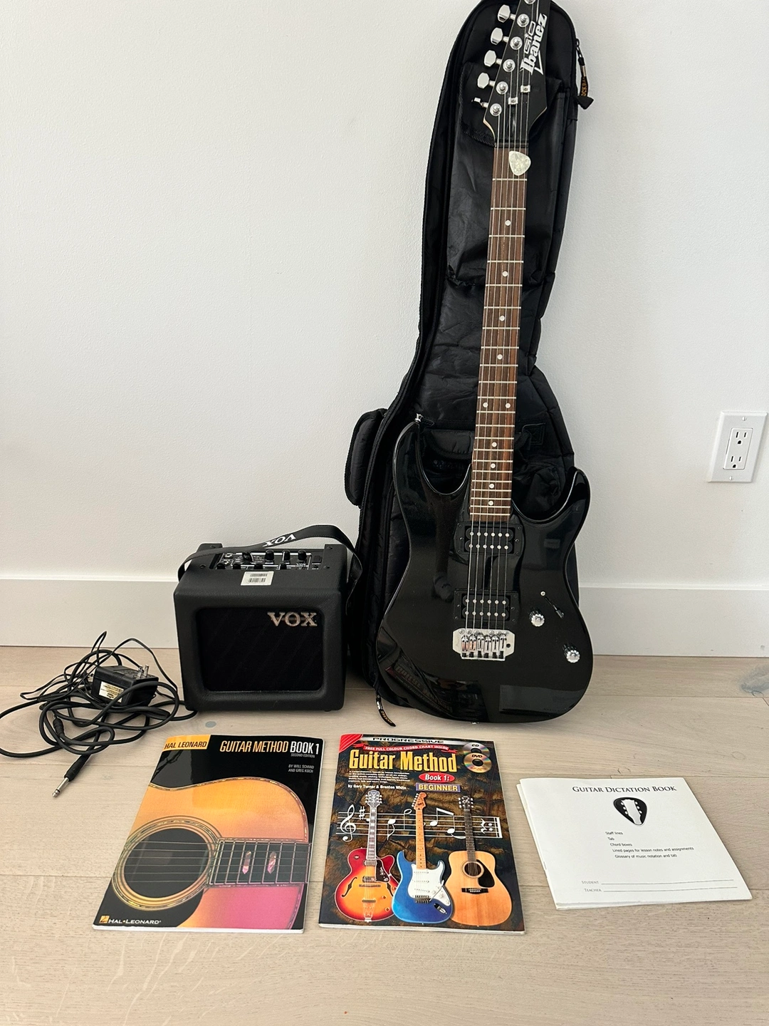 This listing includes an Ibanez electric guitar, a Vox practice amp, a guitar strap, a guitar method book, and a guitar dictation book.
