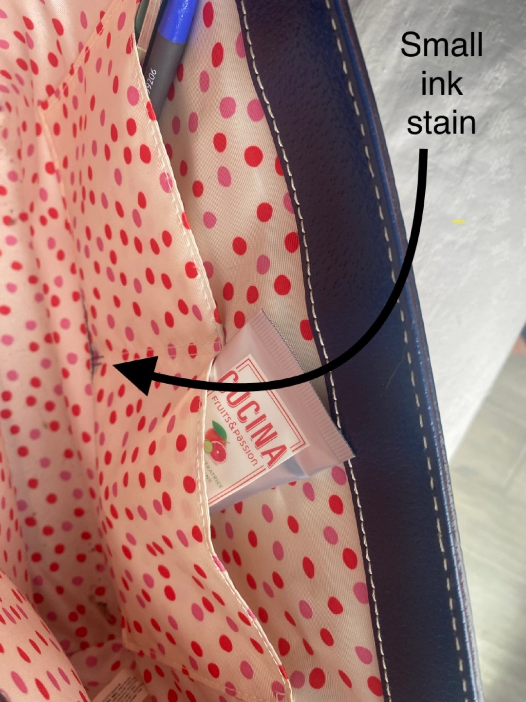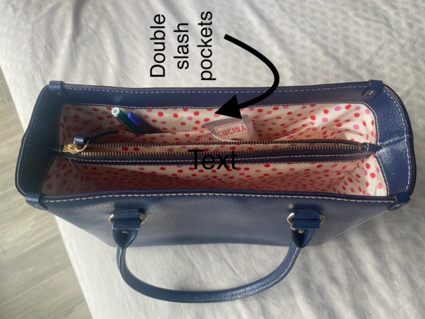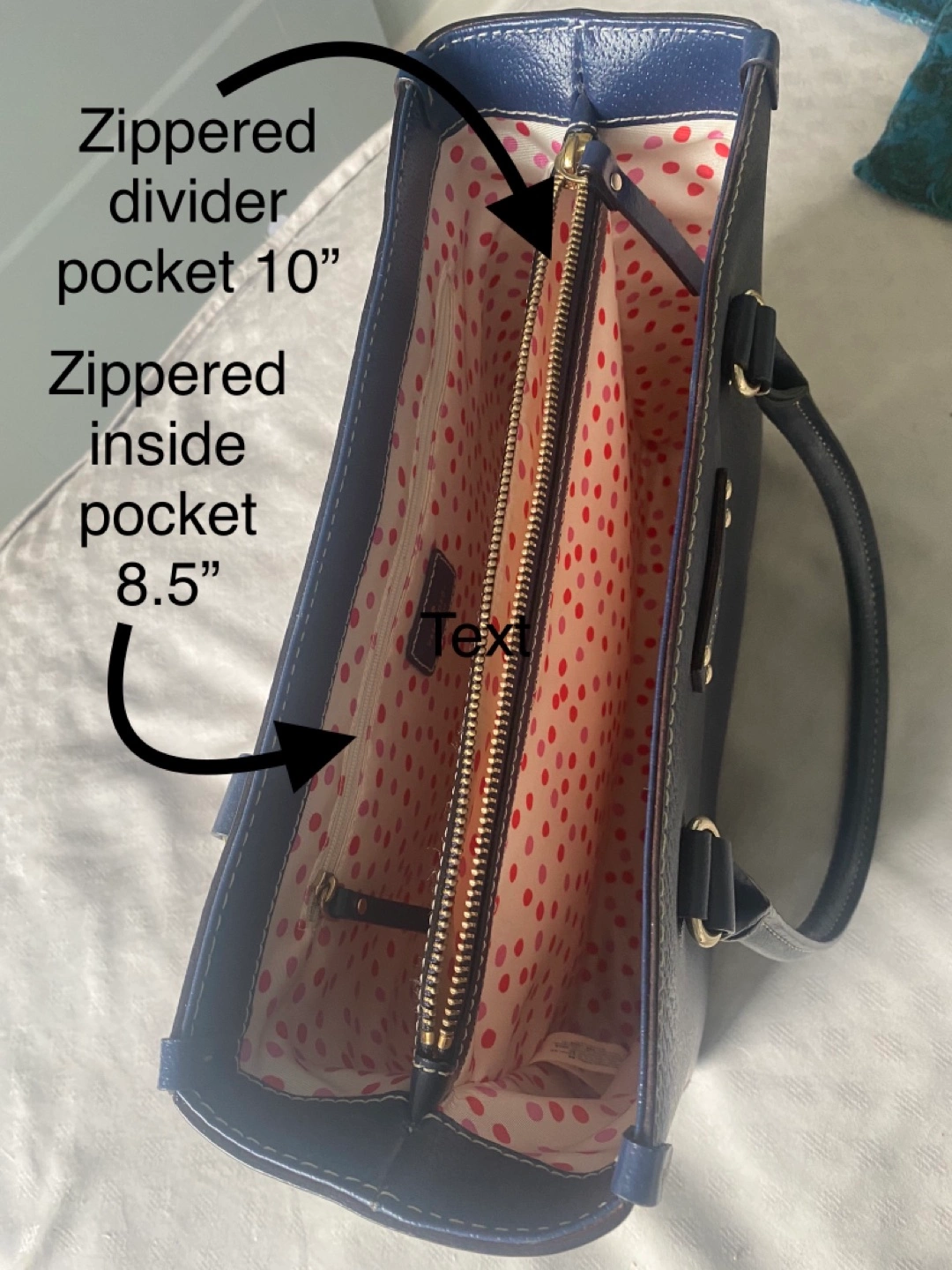 Medium blue leather with fun polka dot lining. Two large zippered pockets, two small slash pockets. Small ink stain inside. Otherwise in immaculate condition.