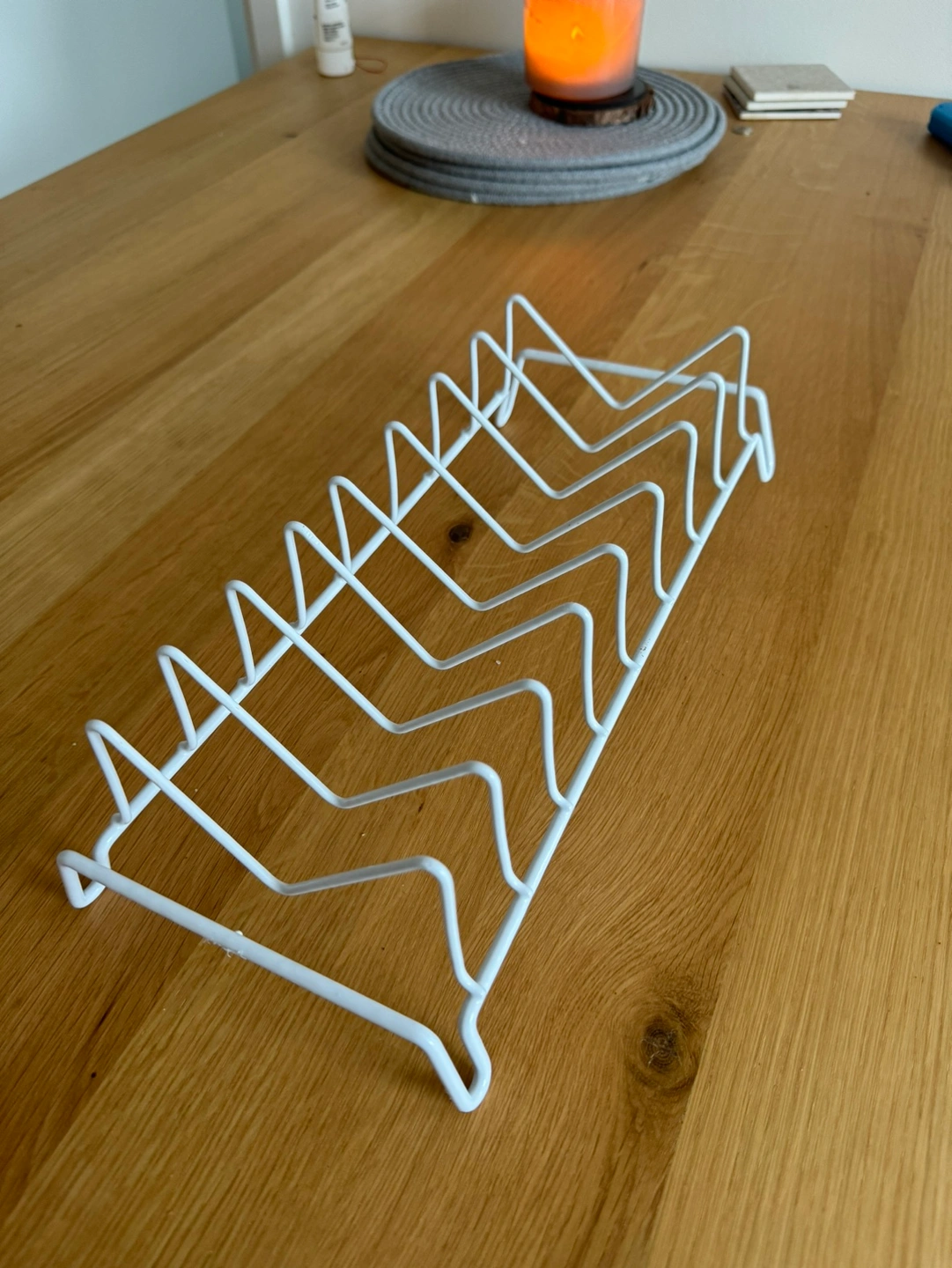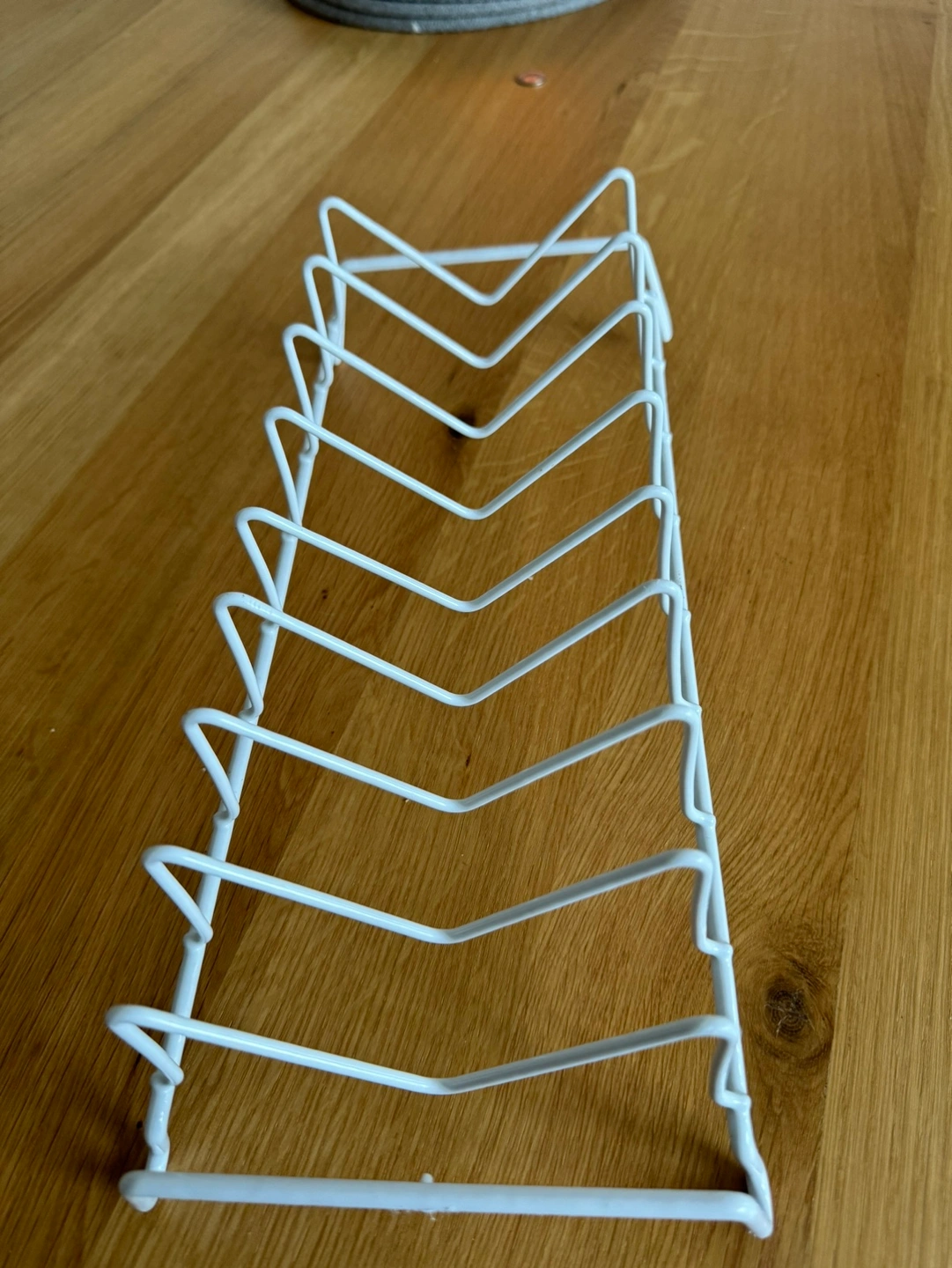 172A white wire rack that holds 8 lids/plates. It is perfect for organizing your dishes or keeping them dry.