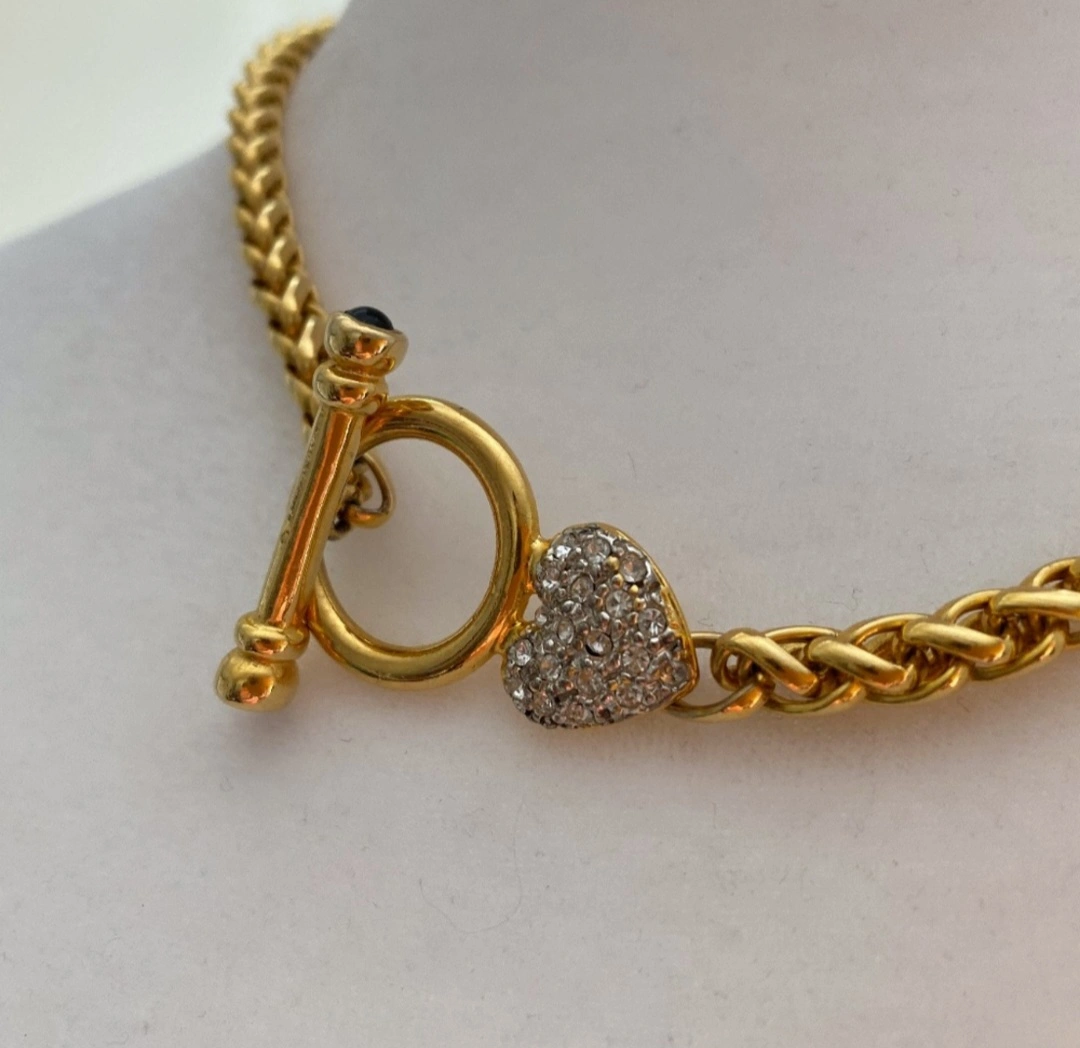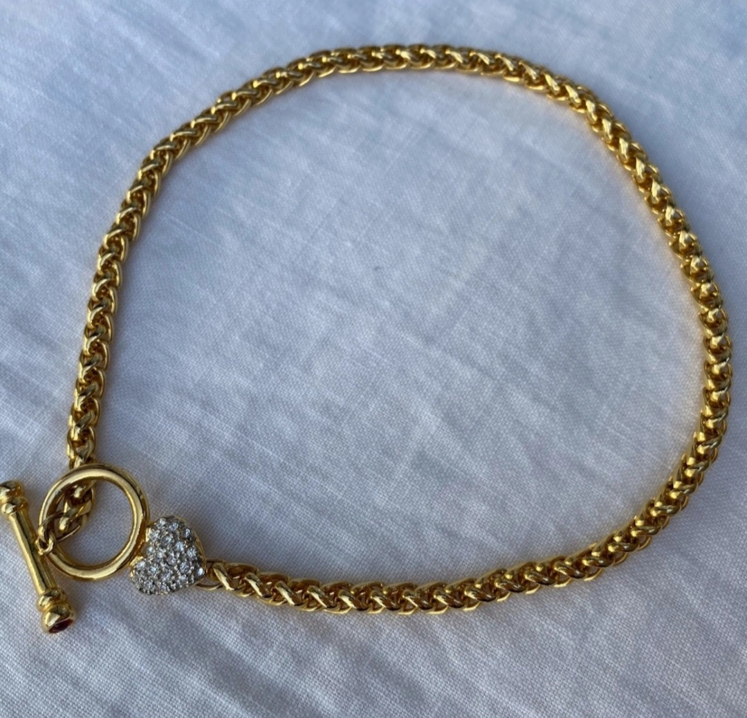 This necklace features a gold chain with a heart charm. The charm is adorned with rhinestones. The necklace is approximately 16 inches in length. It is a beautiful piece of jewelry that would make a great gift for any occasion.