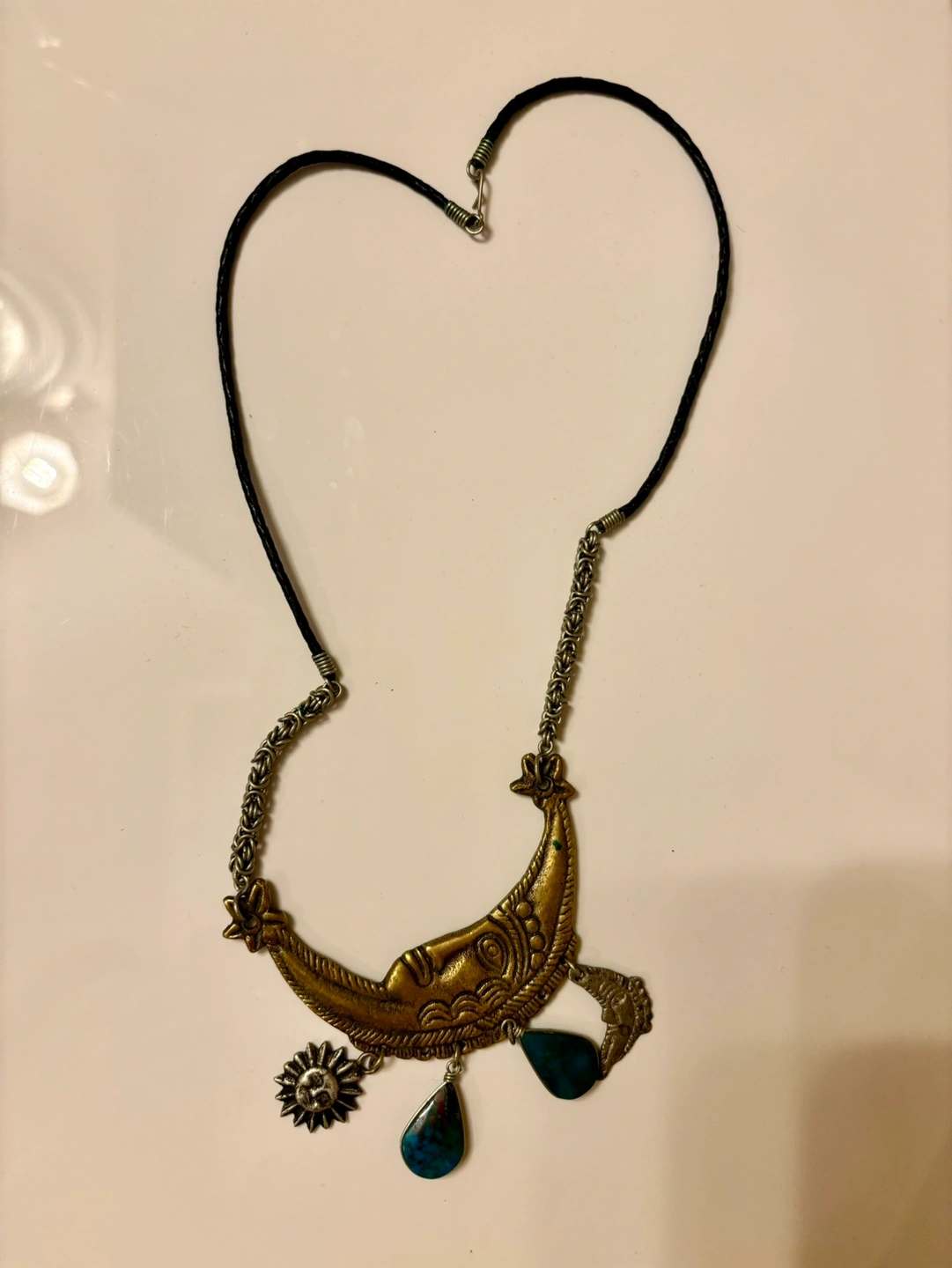 A silver chain necklace with a large crescent moon pendant and sun and moon charms. The pendant features a face in the moon and two turquoise stone drops. The necklace has a black leather cord and silver clasp.
