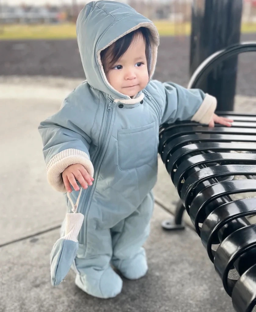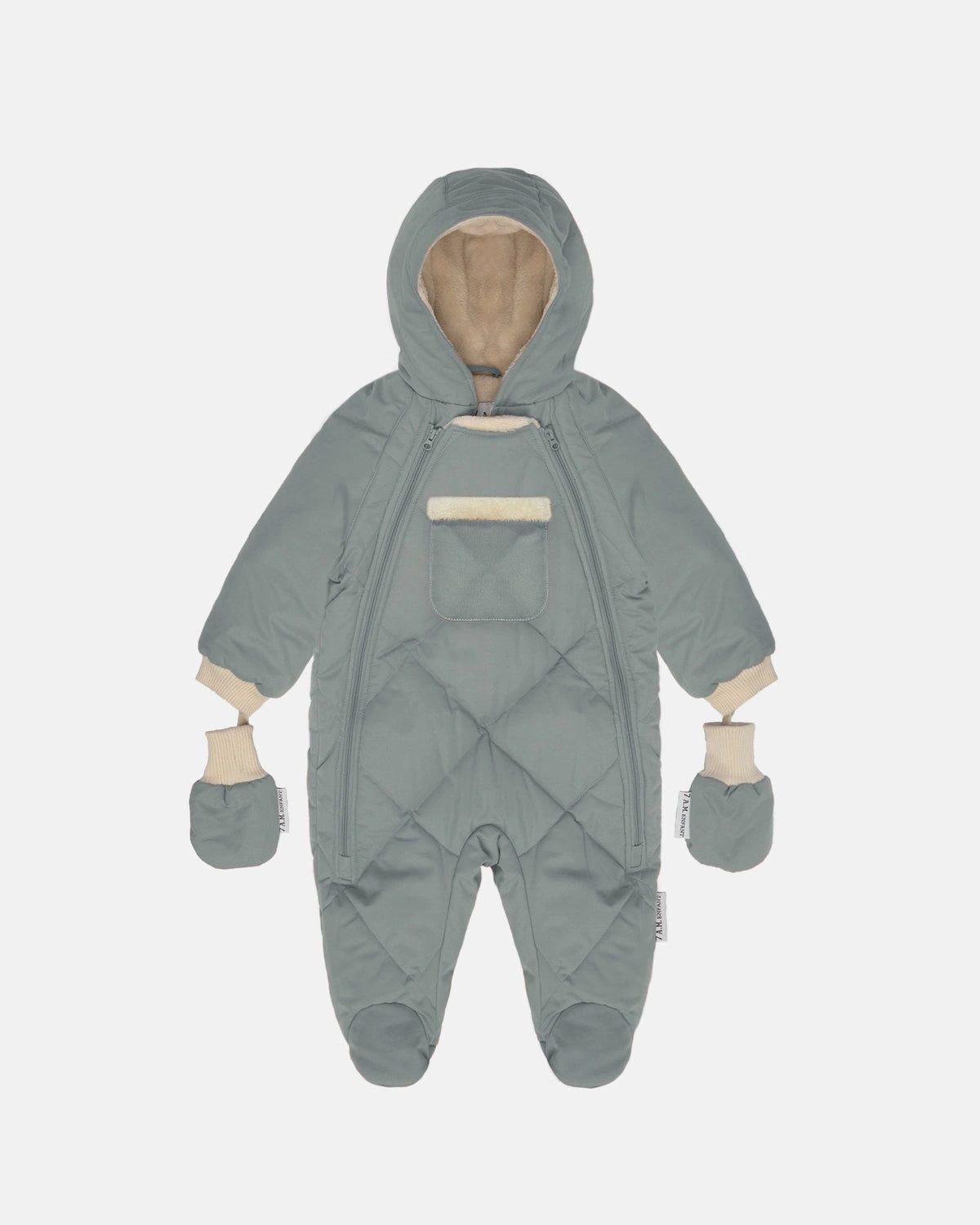 A cute baby snowsuit with a hood, mittens, and a pocket. The snowsuit is a blue-green colour. It is made of a soft, warm material. Age 3-6 months.