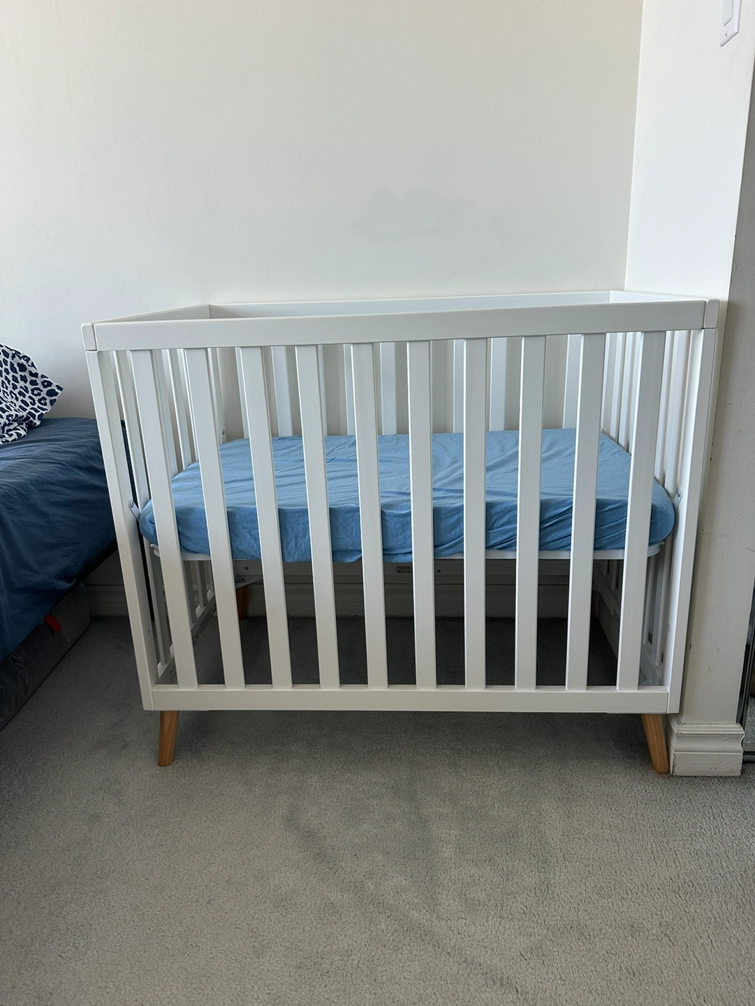 - mini crib, white colour wooden frame, wooden legs. Dimensions 40""W x 25.75""D x 34.75""H