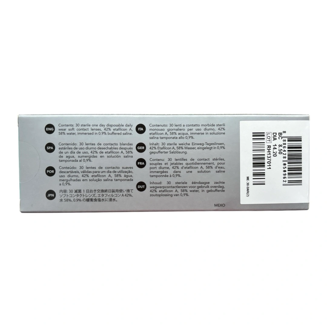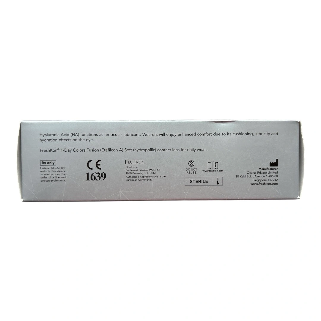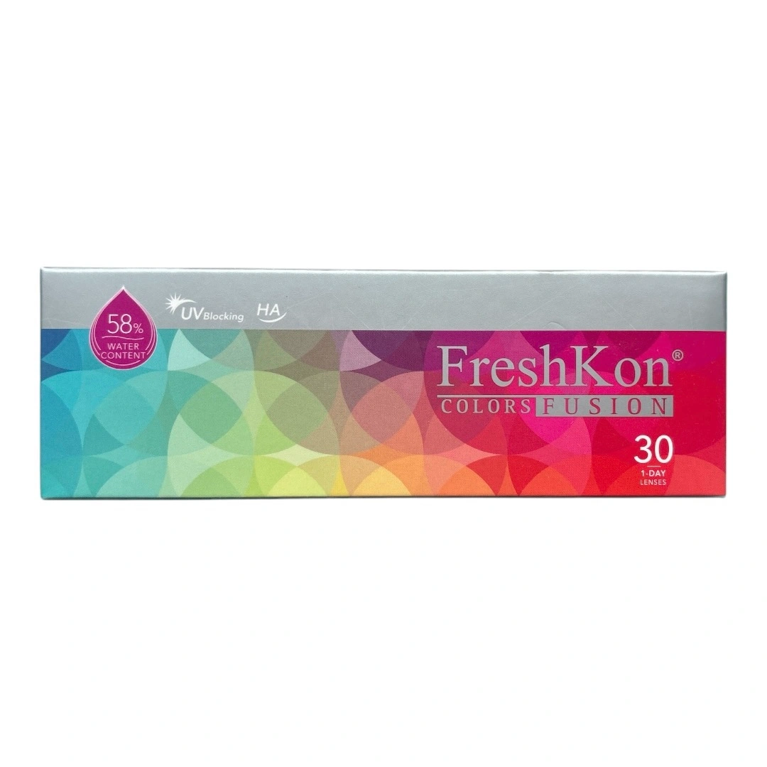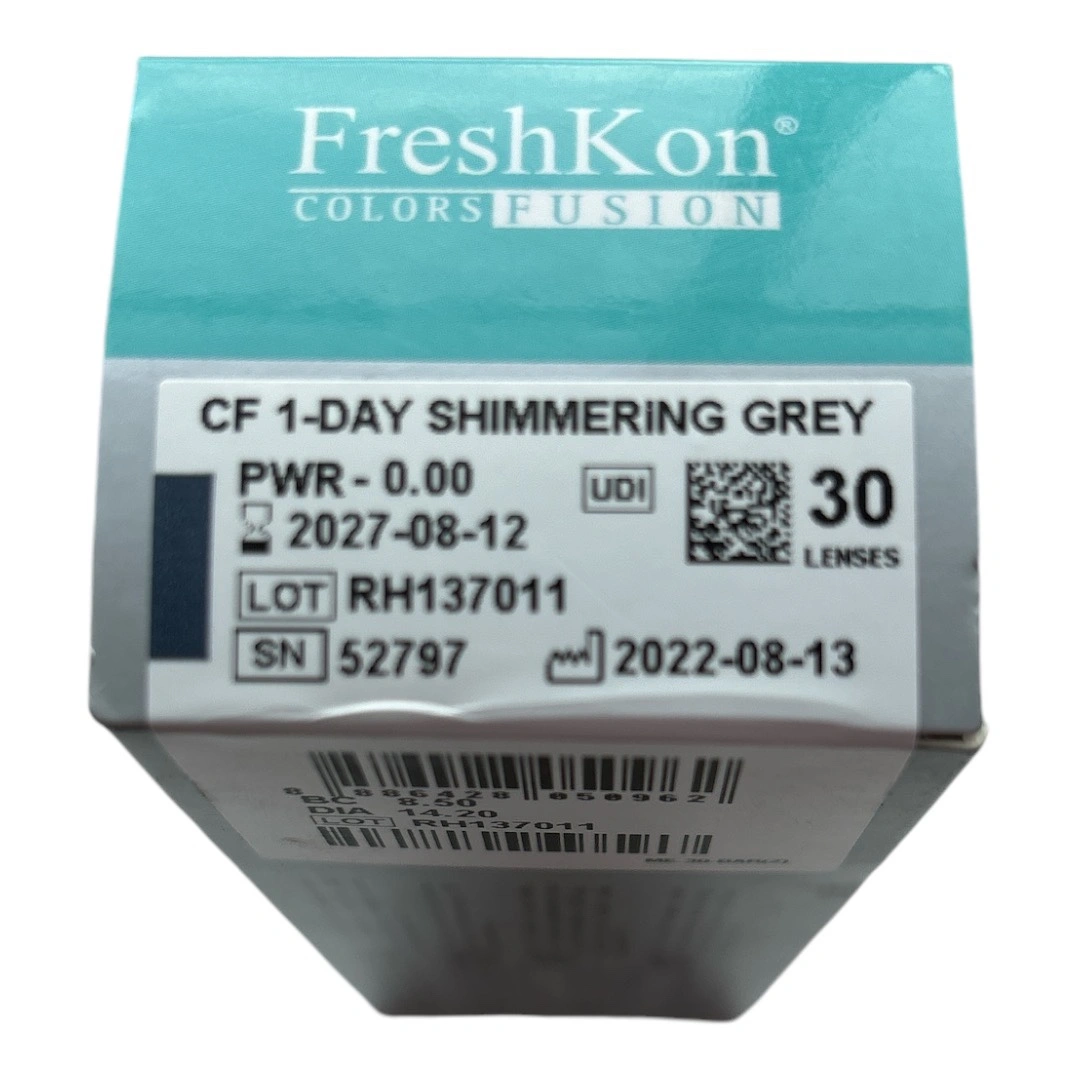 Unopened brand new box of 30 FreshKon Colors Fusion 1-Day Shimmering Grey contact lenses. Power 0.00. Expiration on August 12, 2027. Purchased from licensed local optic store.
