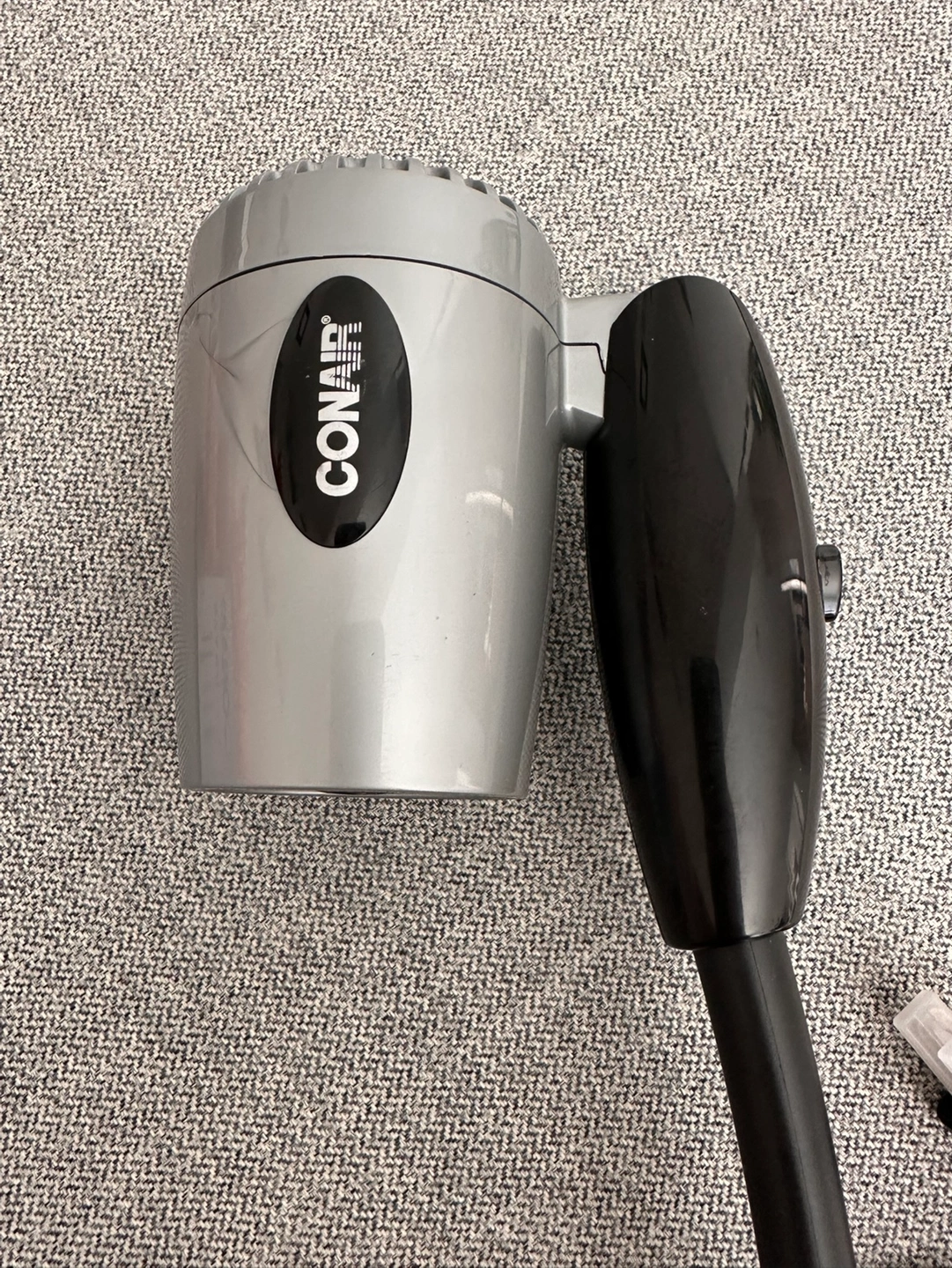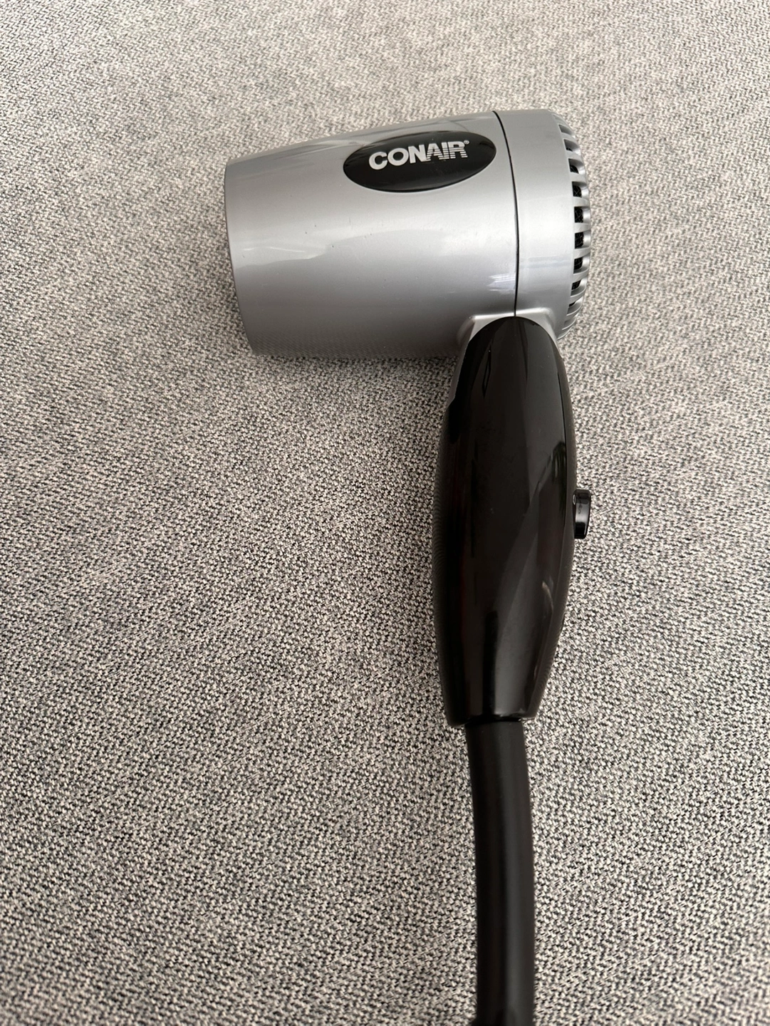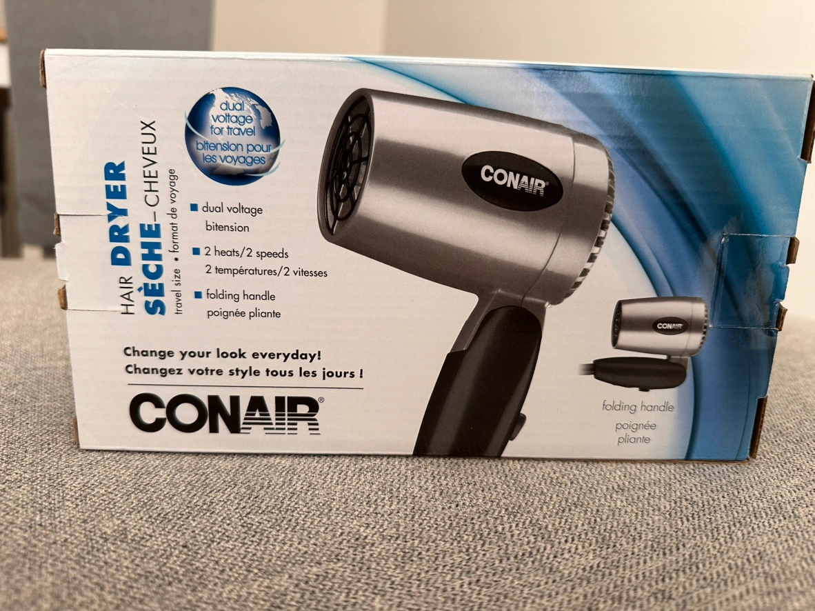 This is a Conair travel hair dryer with two heat settings and two speeds. It has a folding handle and dual voltage for travel!!!