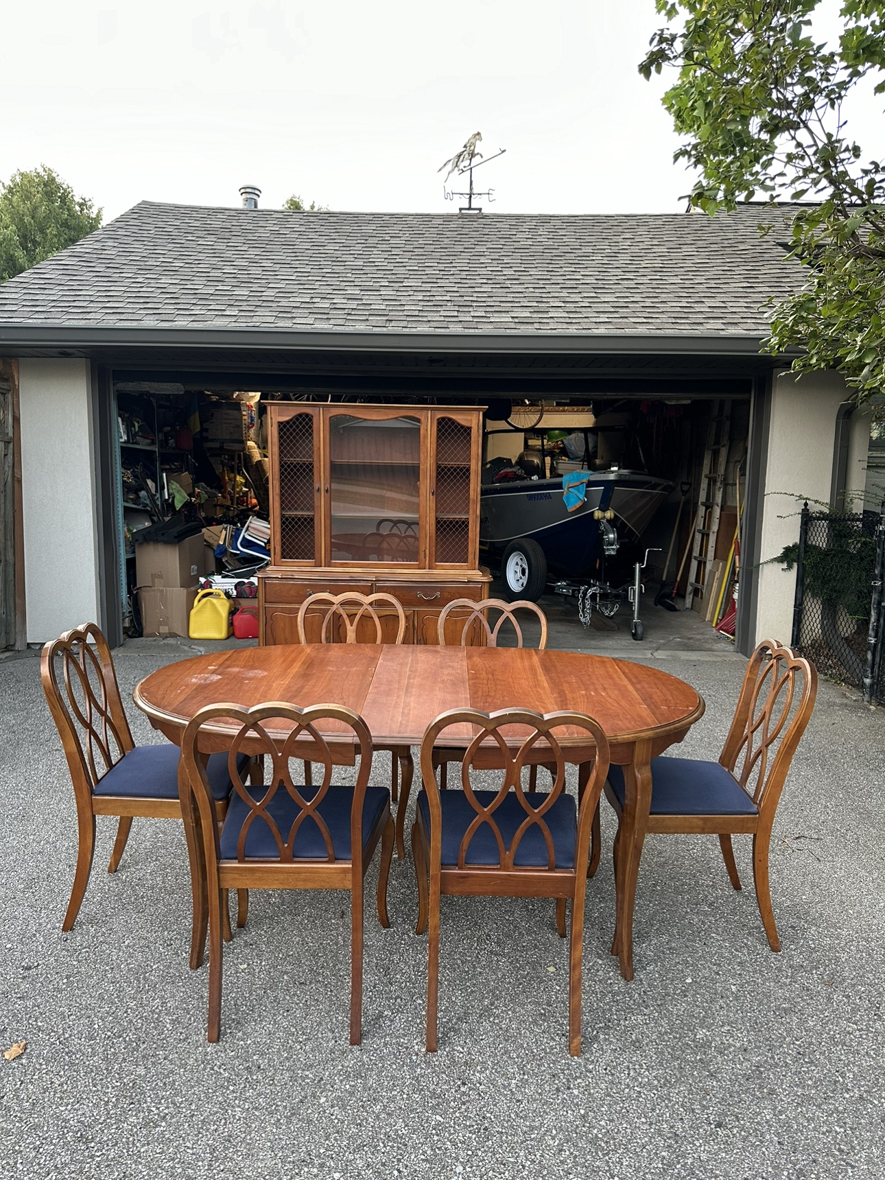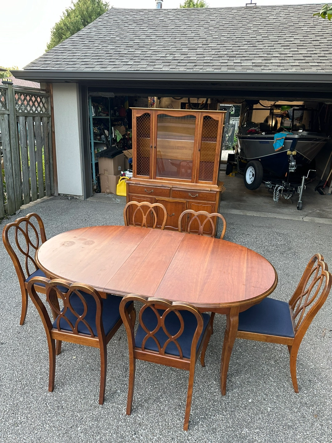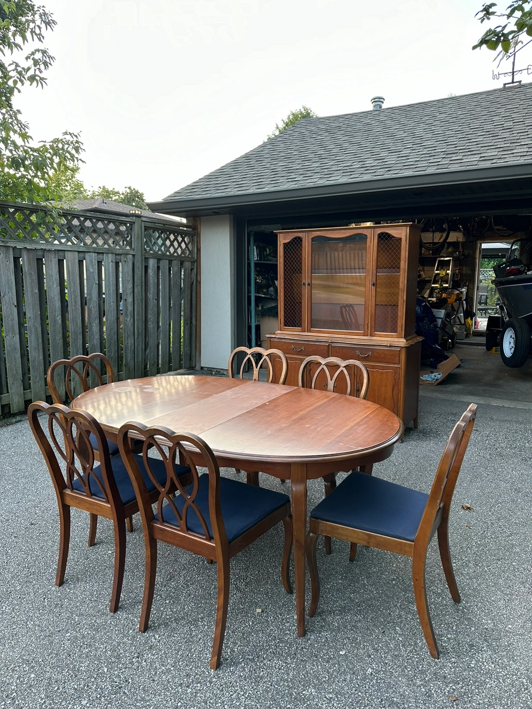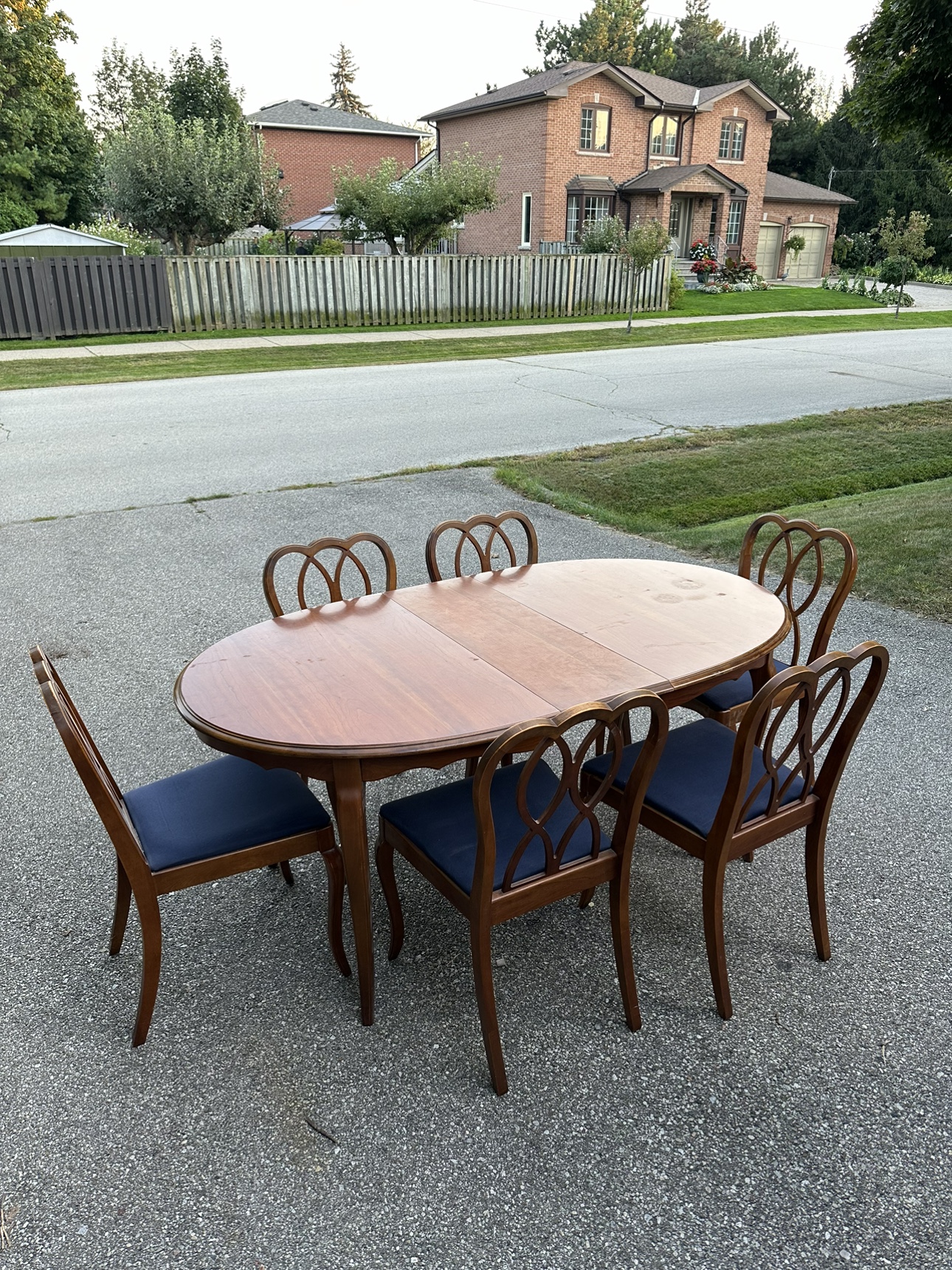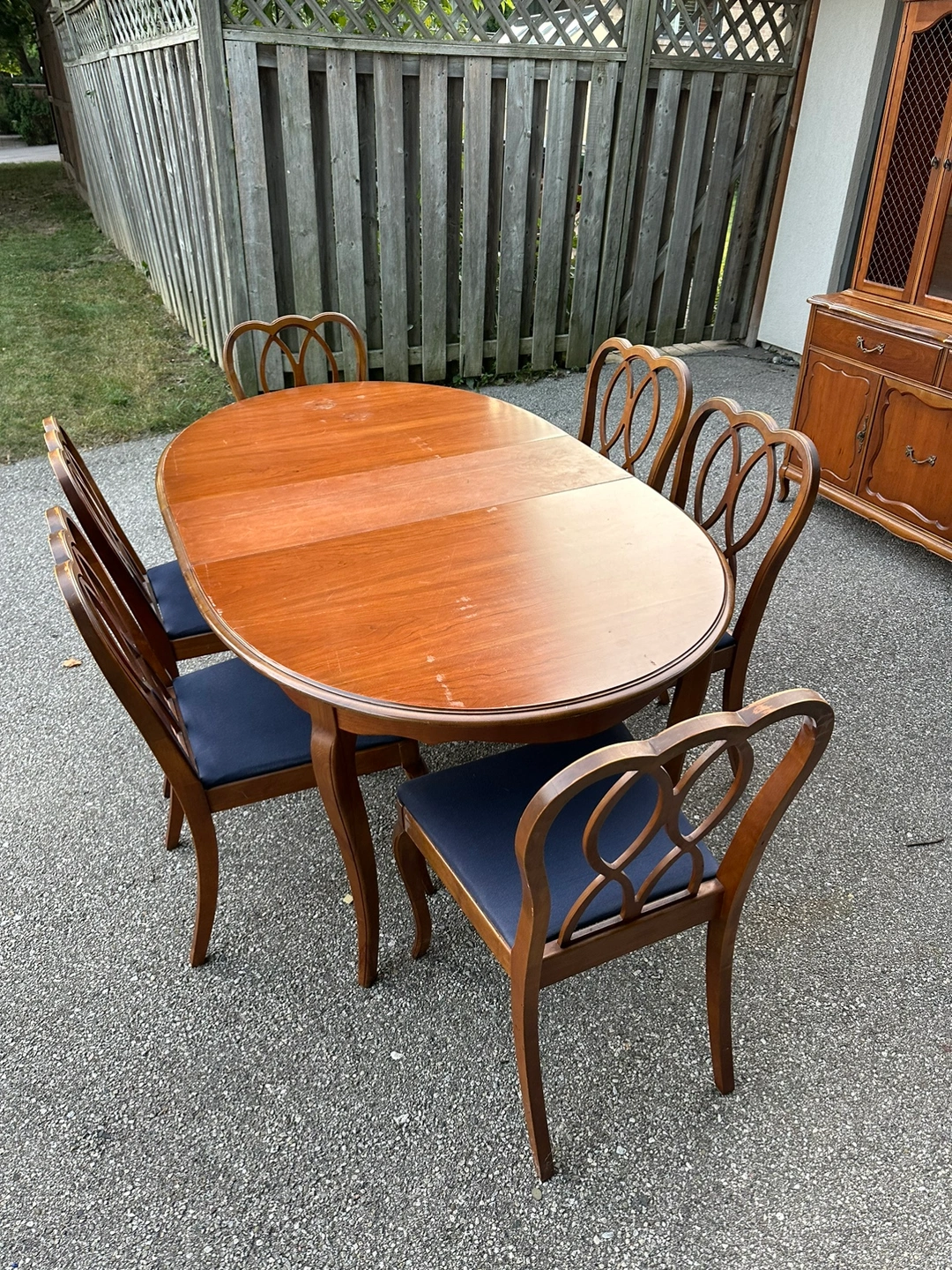 Solid wood antique dining room set. Made by Knechtel, a Canadian based furniture company. Comes with 6 chairs, table extends. The hutch in the background is also included in this listing. It’s in very good condition.