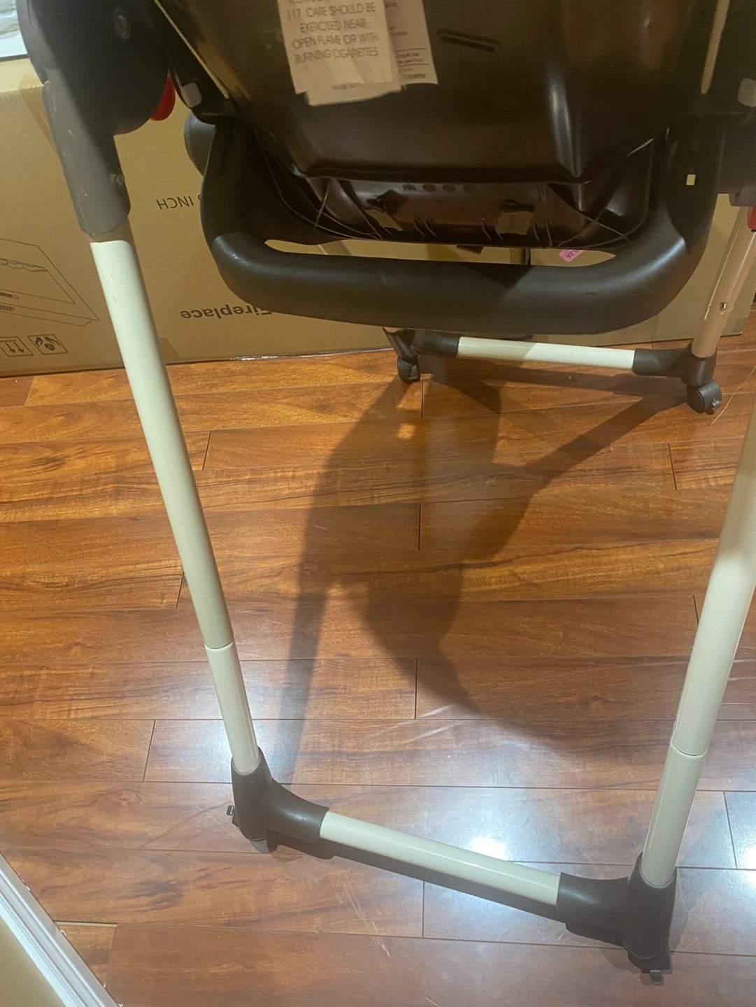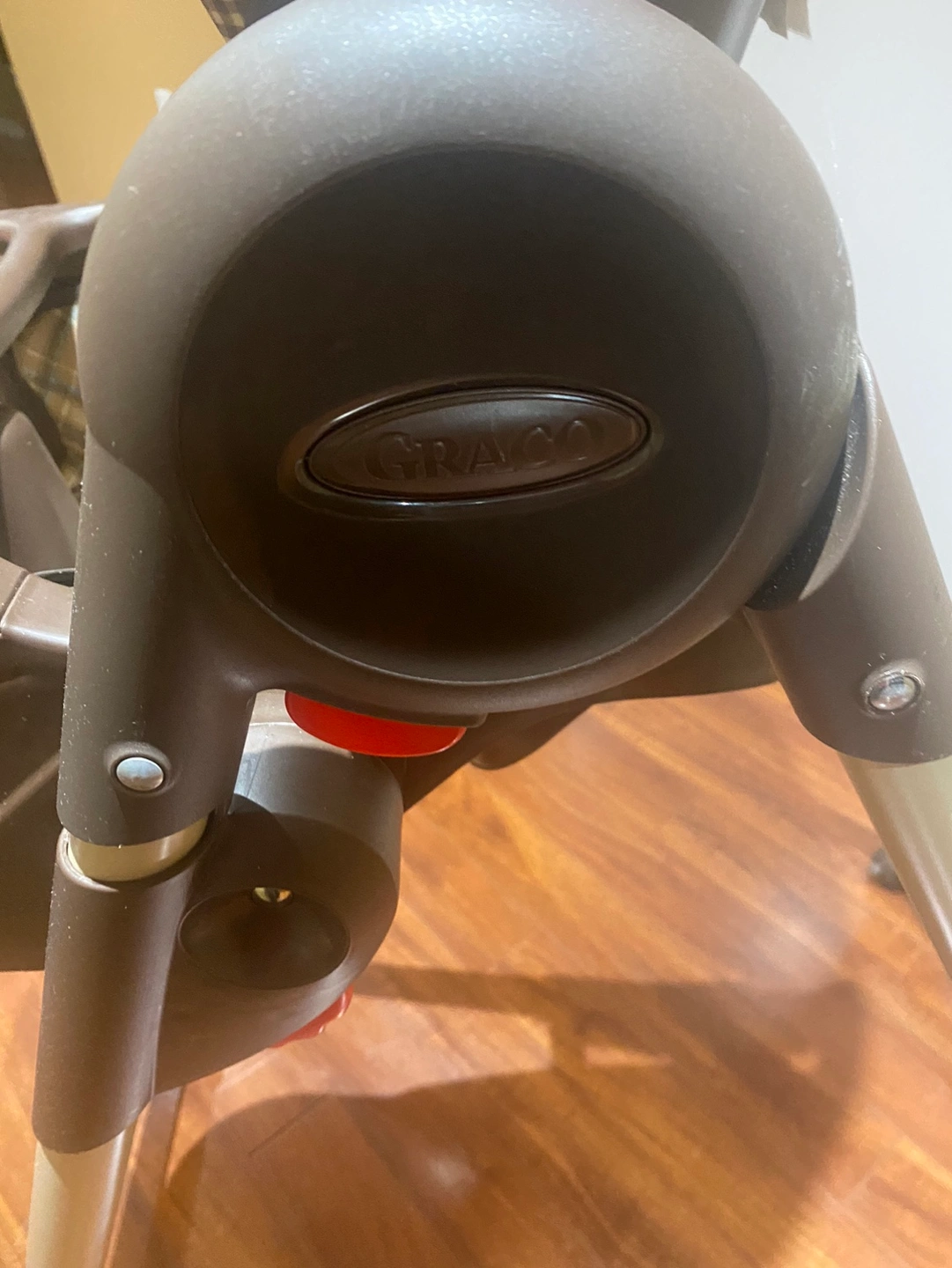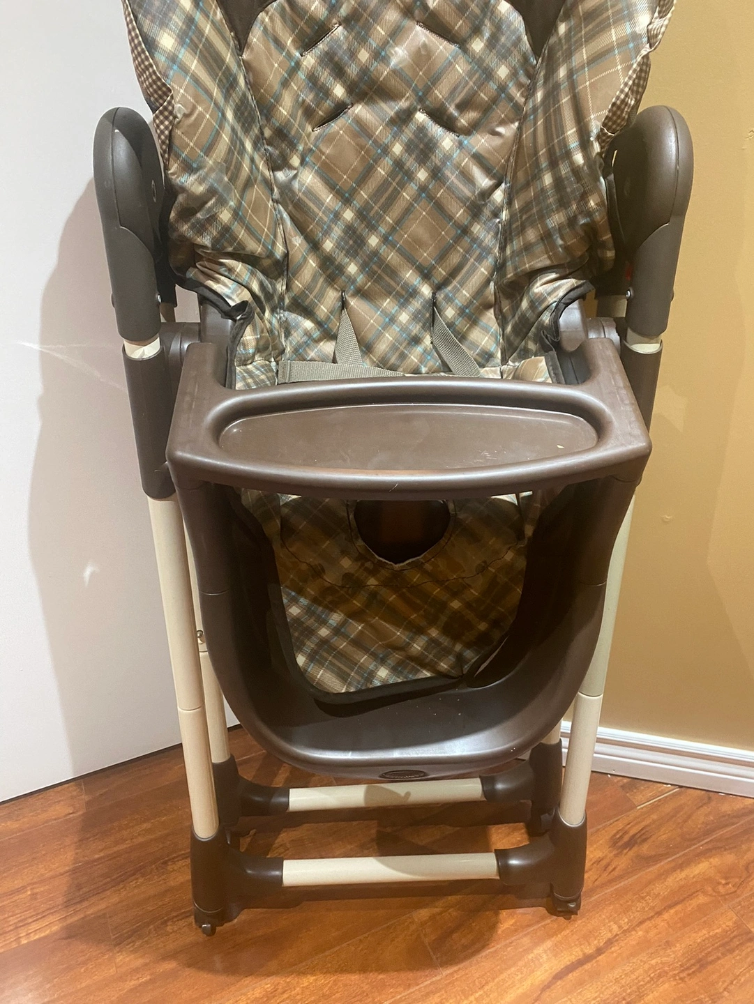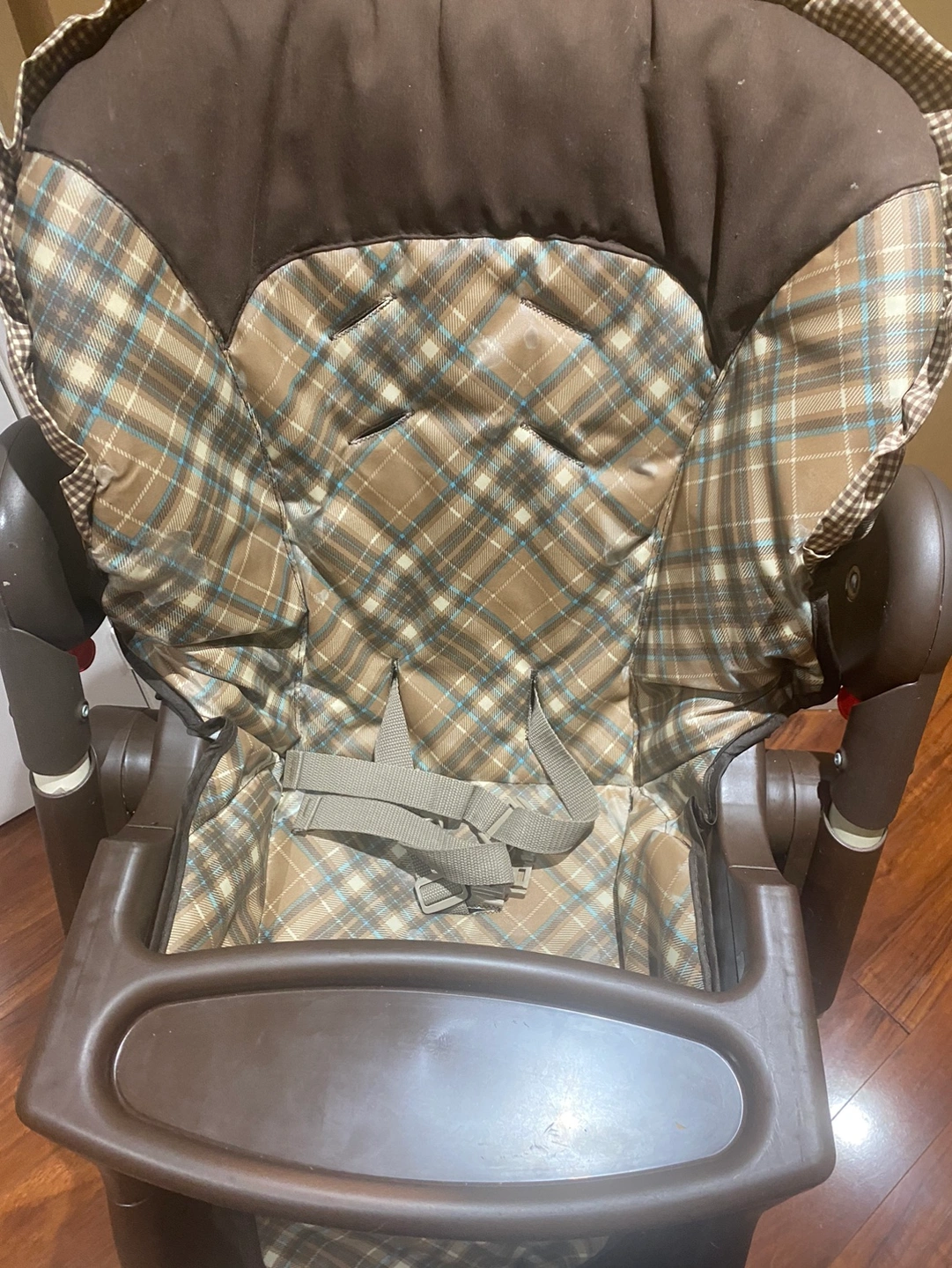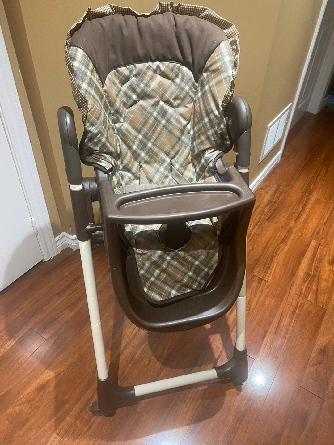 1000+This is a high chair. It has a brown and tan plaid pattern. It has wheels on the bottom and can be adjusted to different heights. It has a tray. Please check my other listings too - thanks