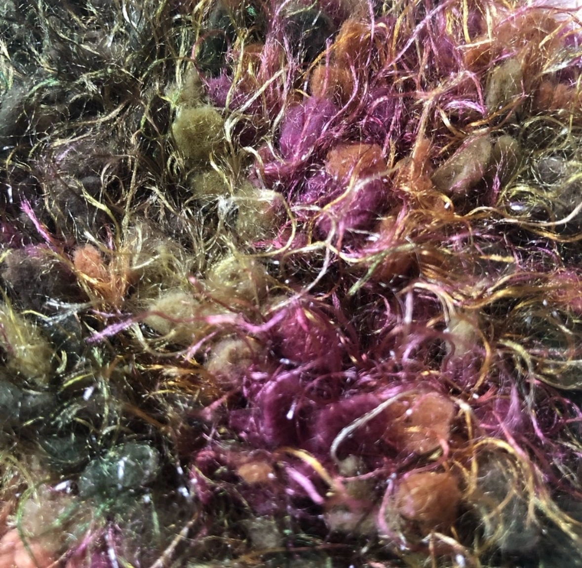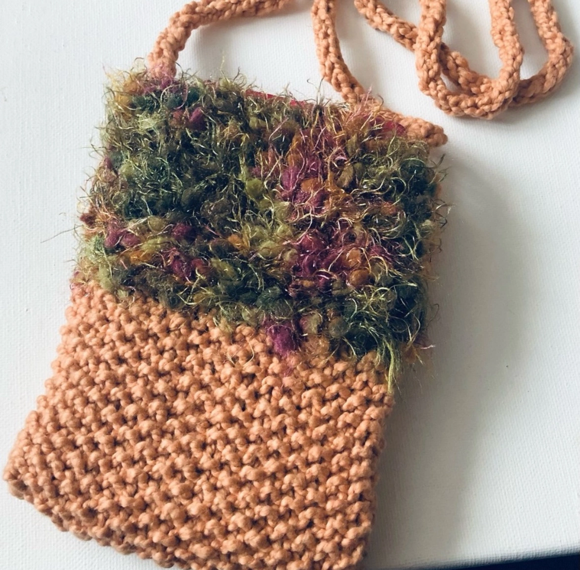 Handmade, knit with vintage yarn, cross body bag. Accented with eyelash yarn with green tones.