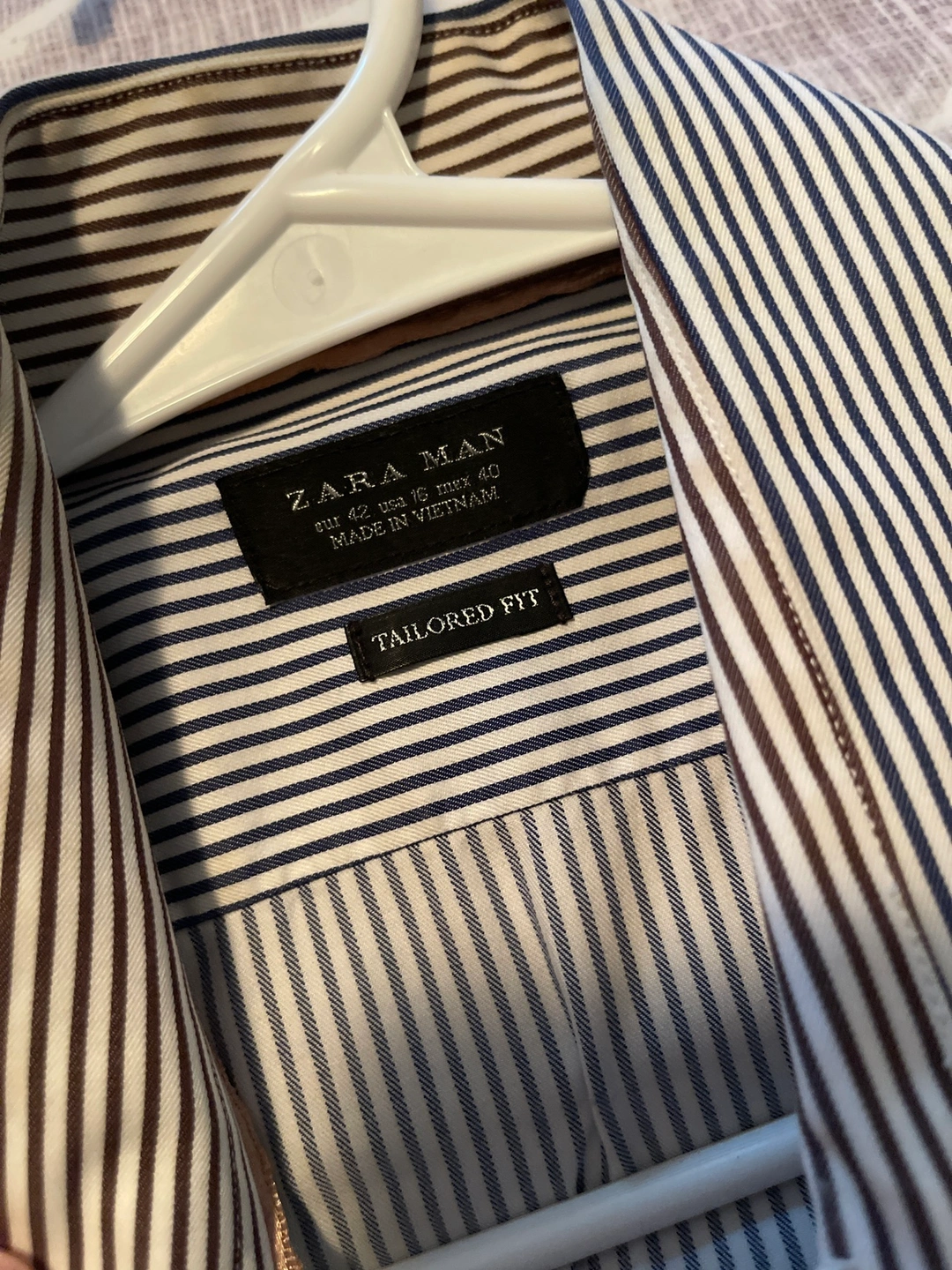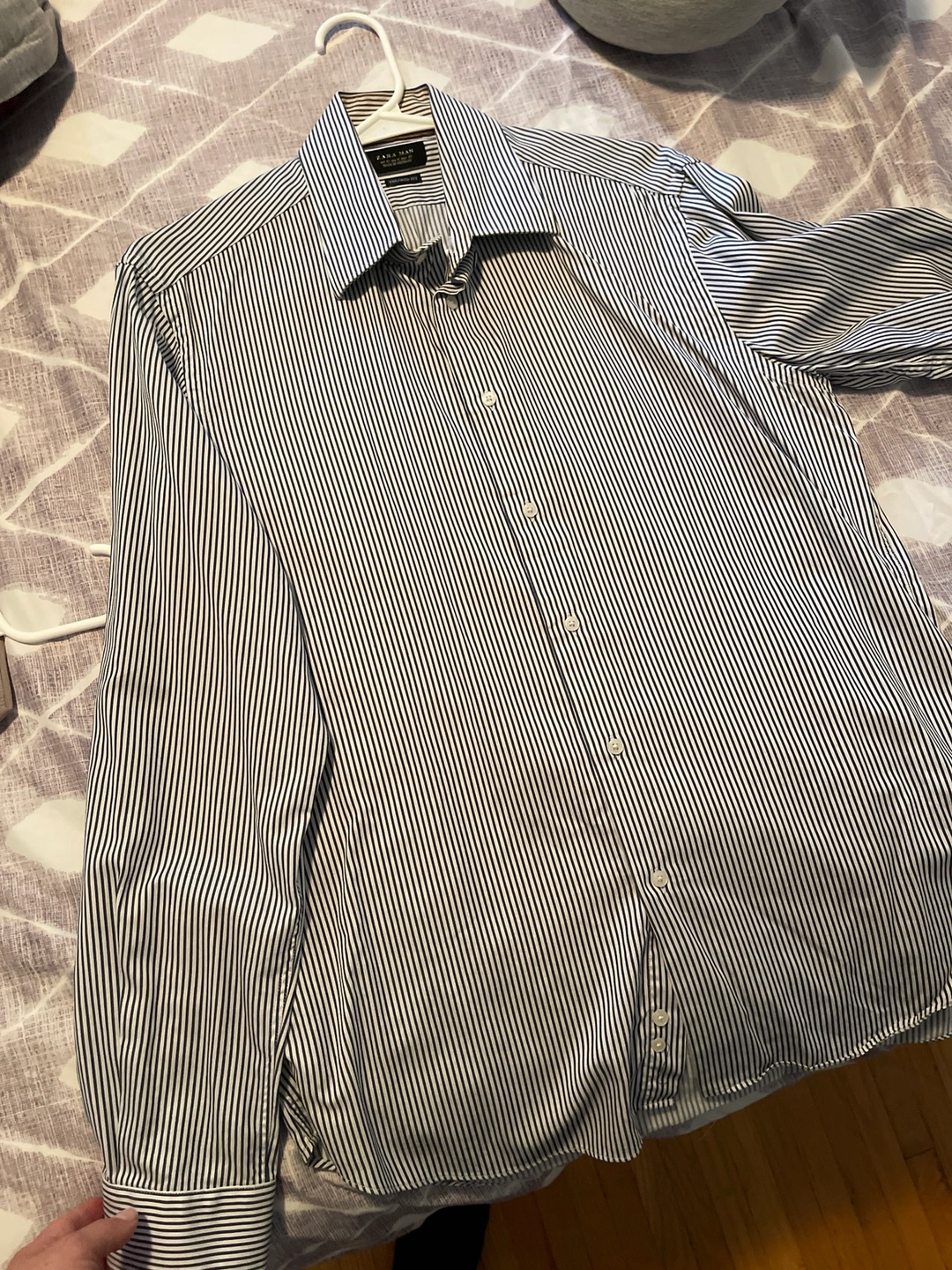 A men's long-sleeved, striped dress shirt. The shirt has a tailored fit.
