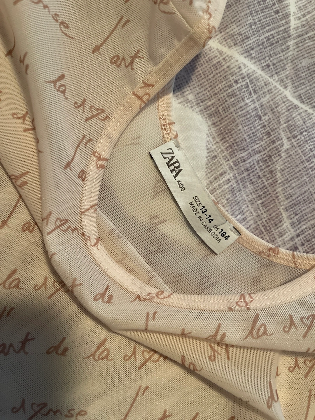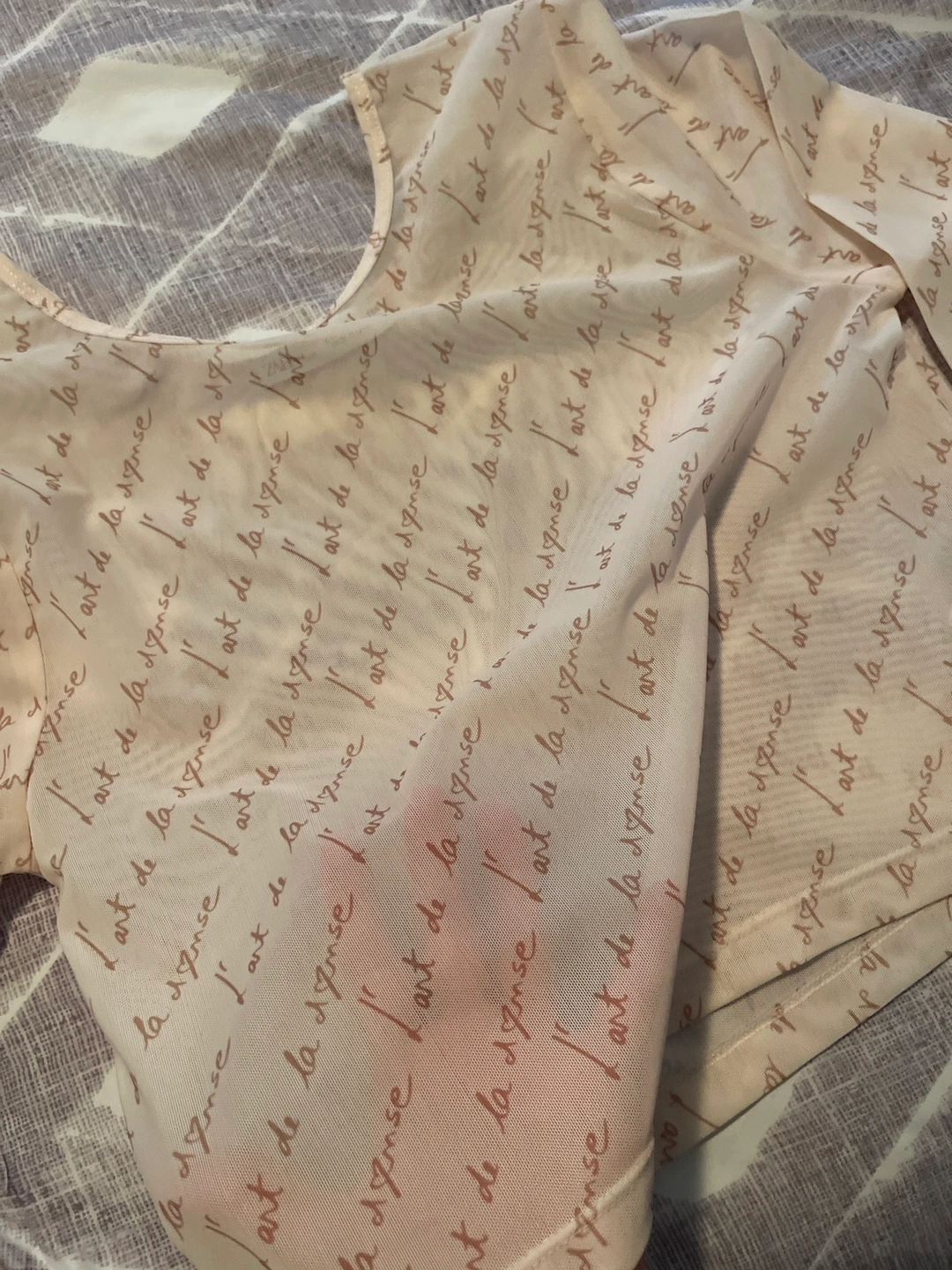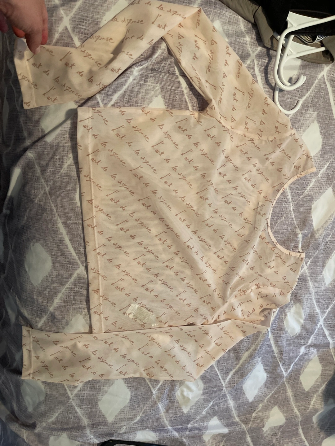 Long sleeve, sheer, top with a brown "art" pattern on a white background.