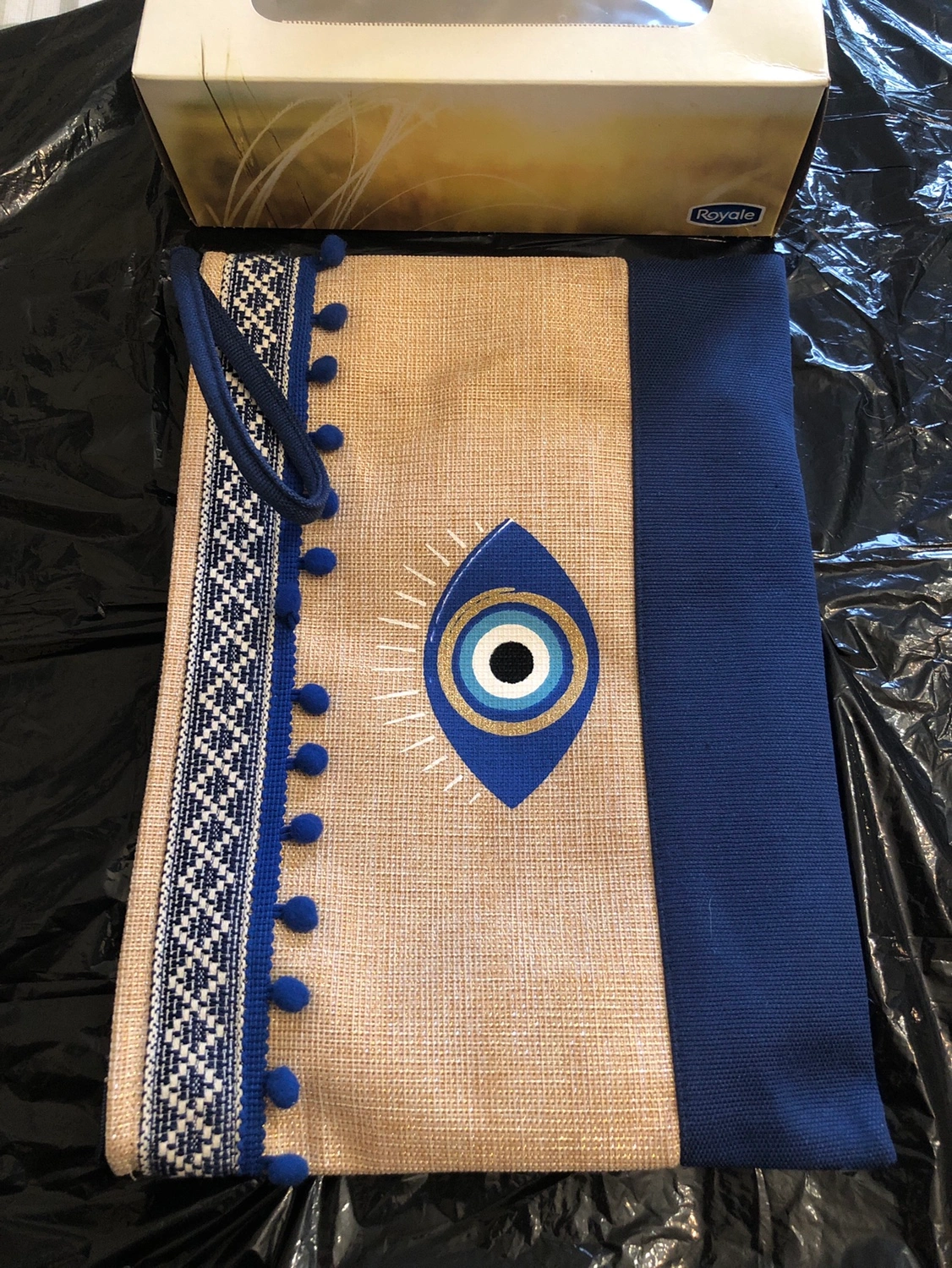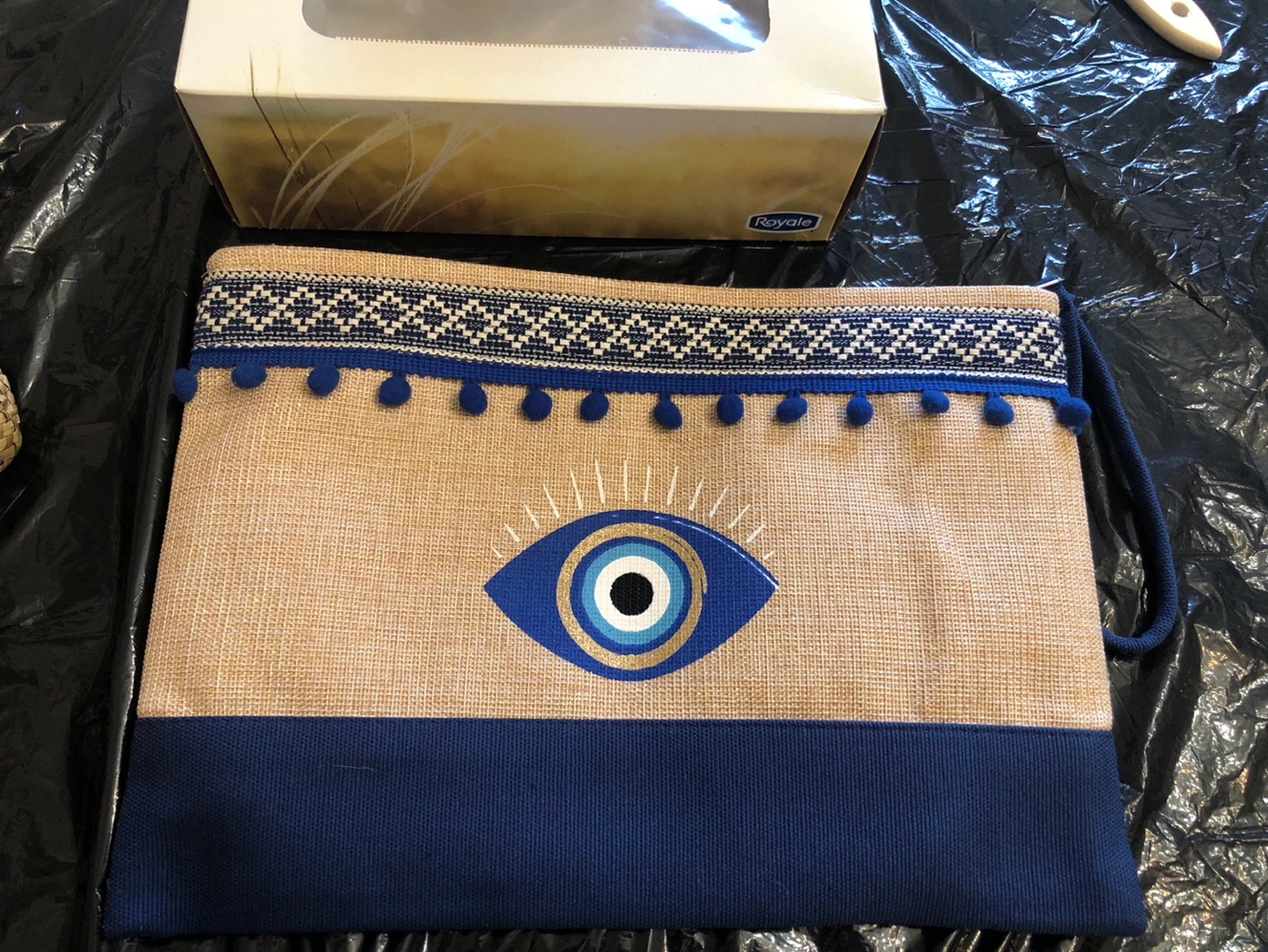 A clutch with an evil eye design. It is made of a burlap-like fabric and has a blue trim. It has a blue and white geometric trim with a tassel.