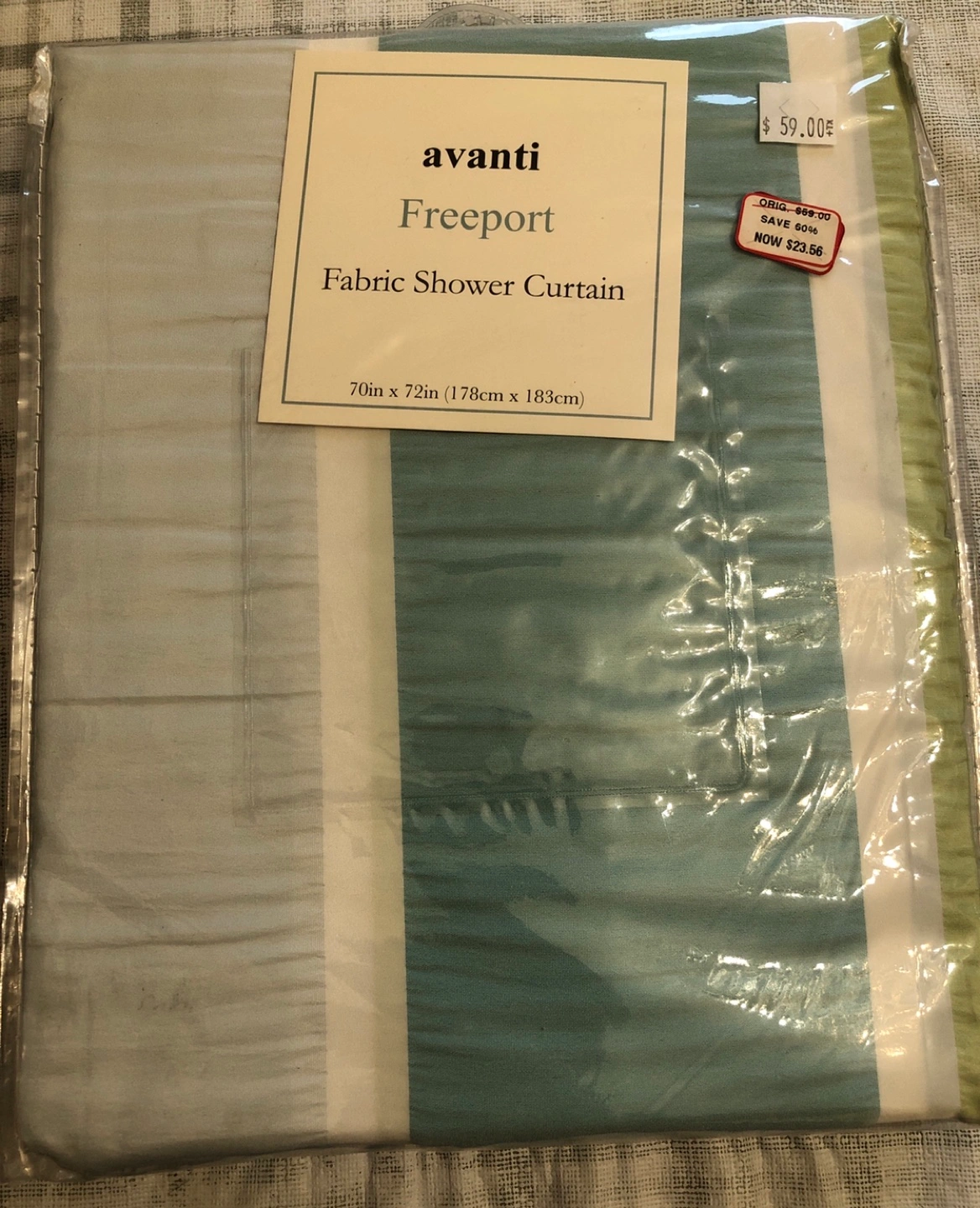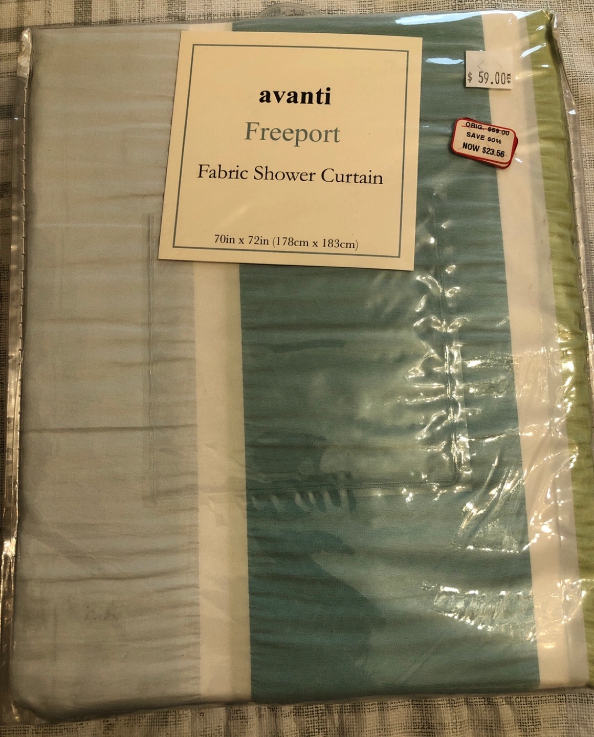 1000+New, in original packaging. 70 inches by 72 inches. Features a striped design in blue, green, and white. Made of 100% polyester. Machine washable. Package includes shower curtain only. From pet and smoke free house. Pick up only. Exact cash only please. Thanks a lot π You might be interested to my other listings π