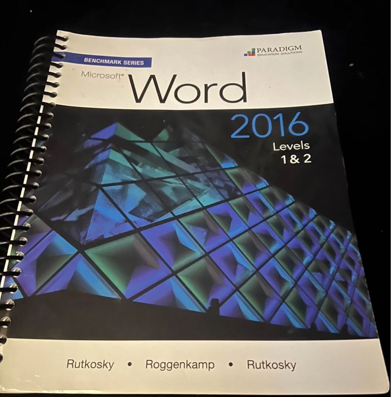 This is a Microsoft Word 2016 textbook, part of the Benchmark series, for levels 1 and 2. The authors are Rutkosky, Roggenkamp, and Rutkosky. It is published by Paradigm Education Solutions. It is spiral bound.