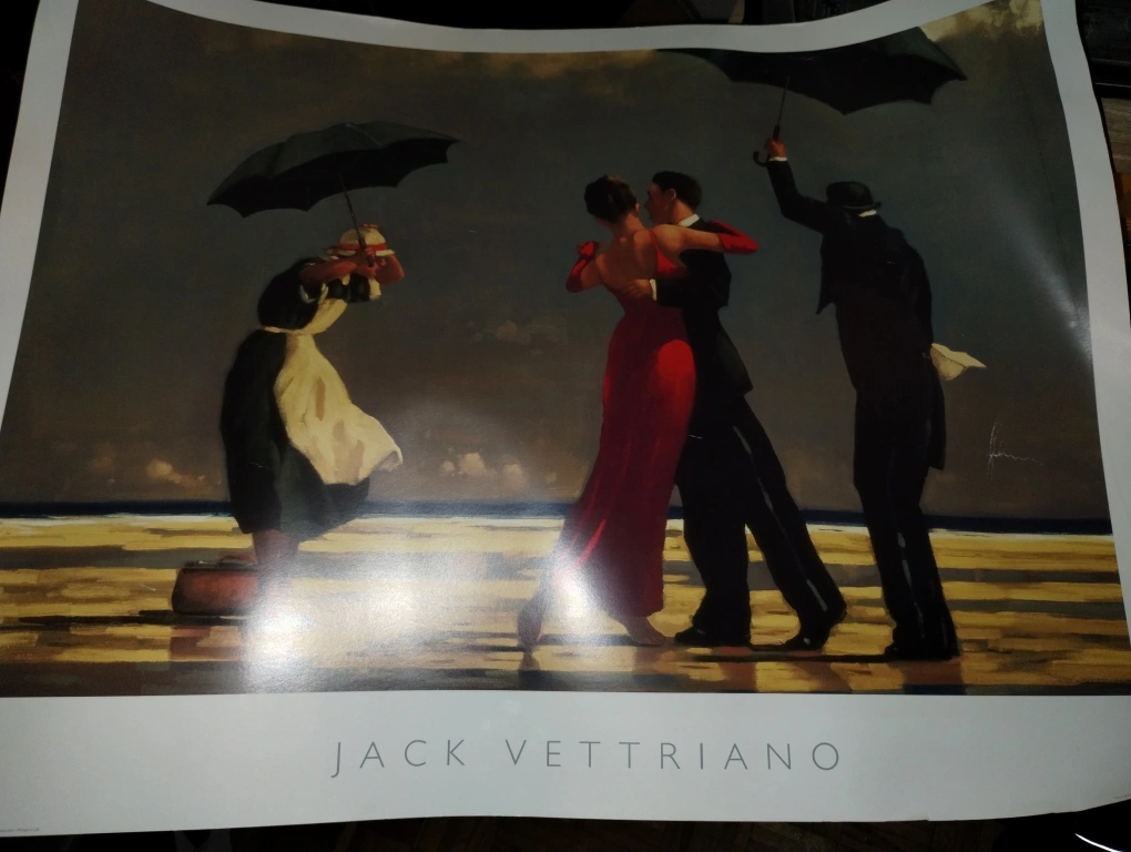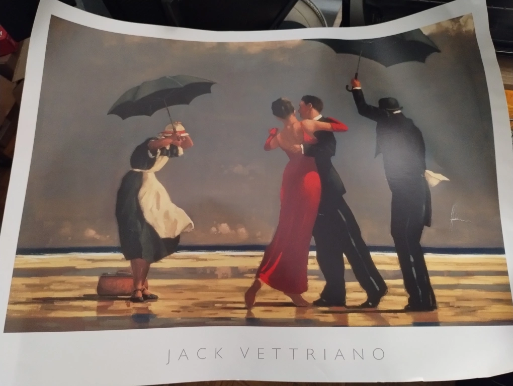 A Jack Vettriano poster print of "The Singing Butler" with a white mat.
