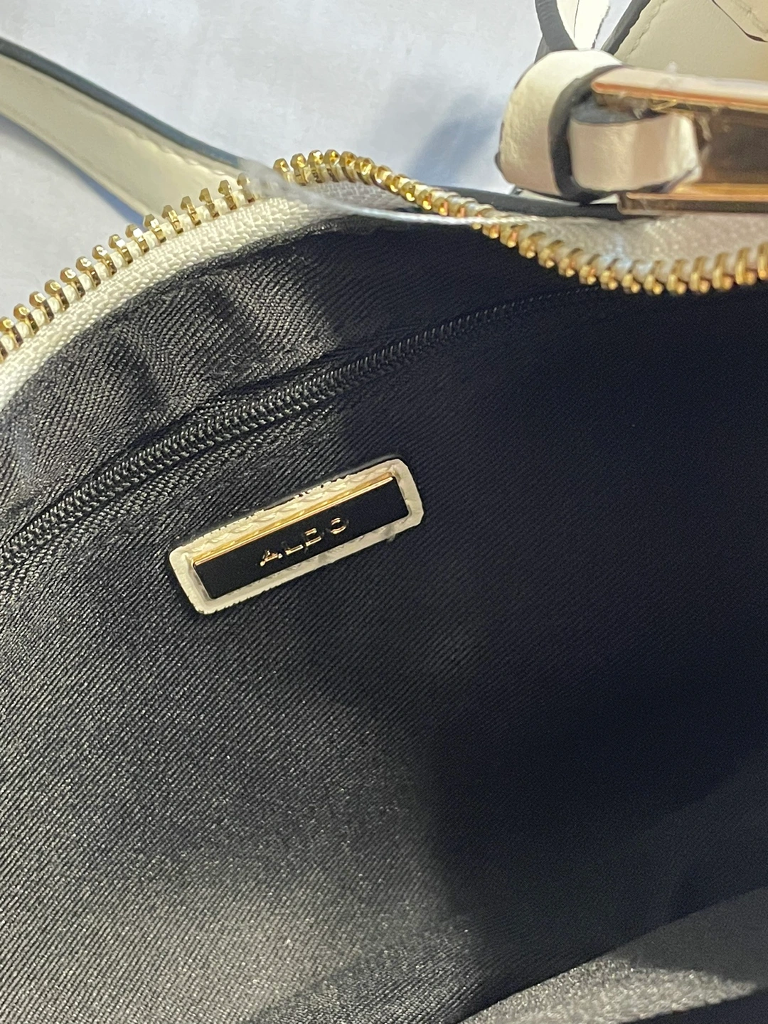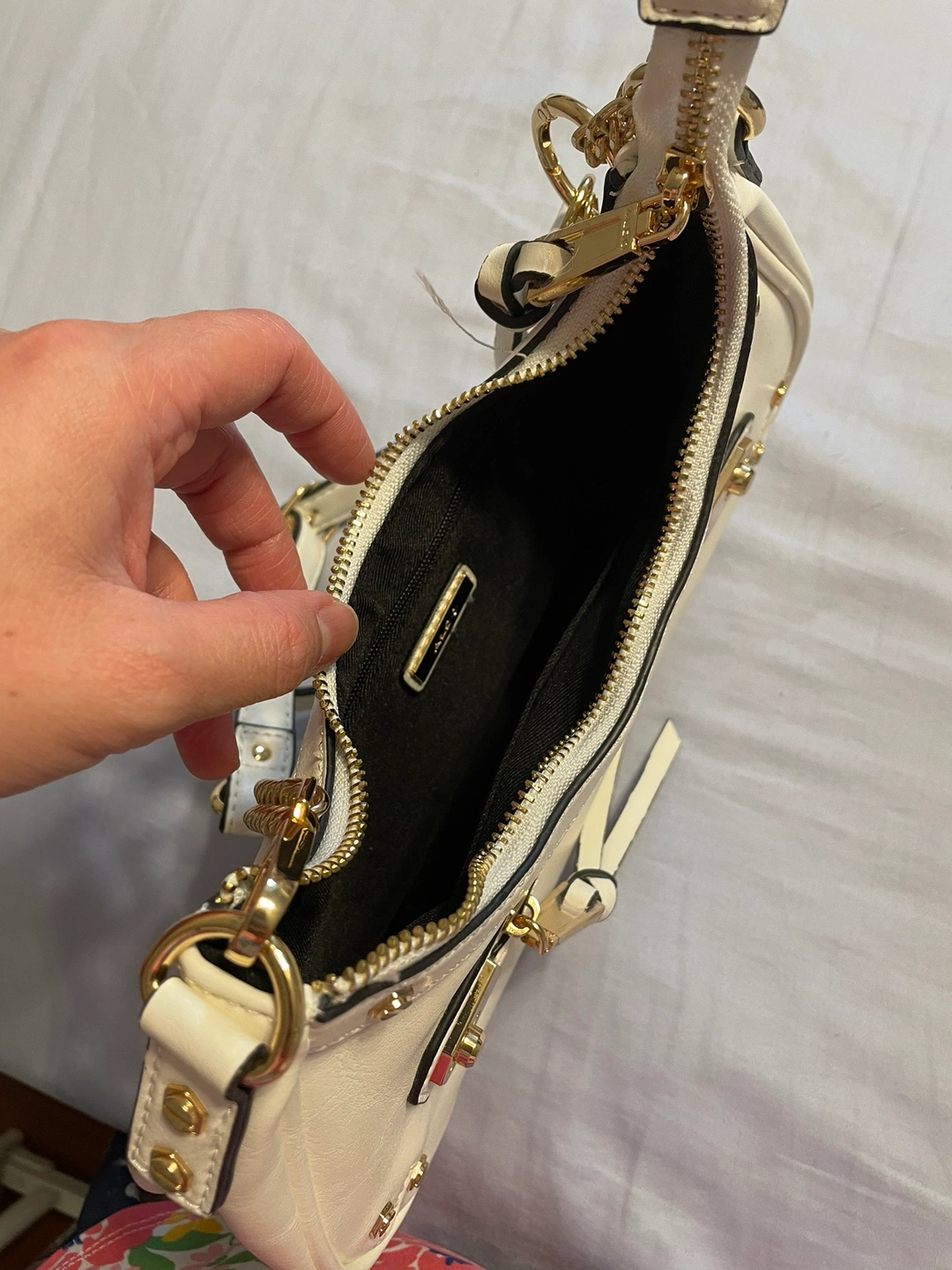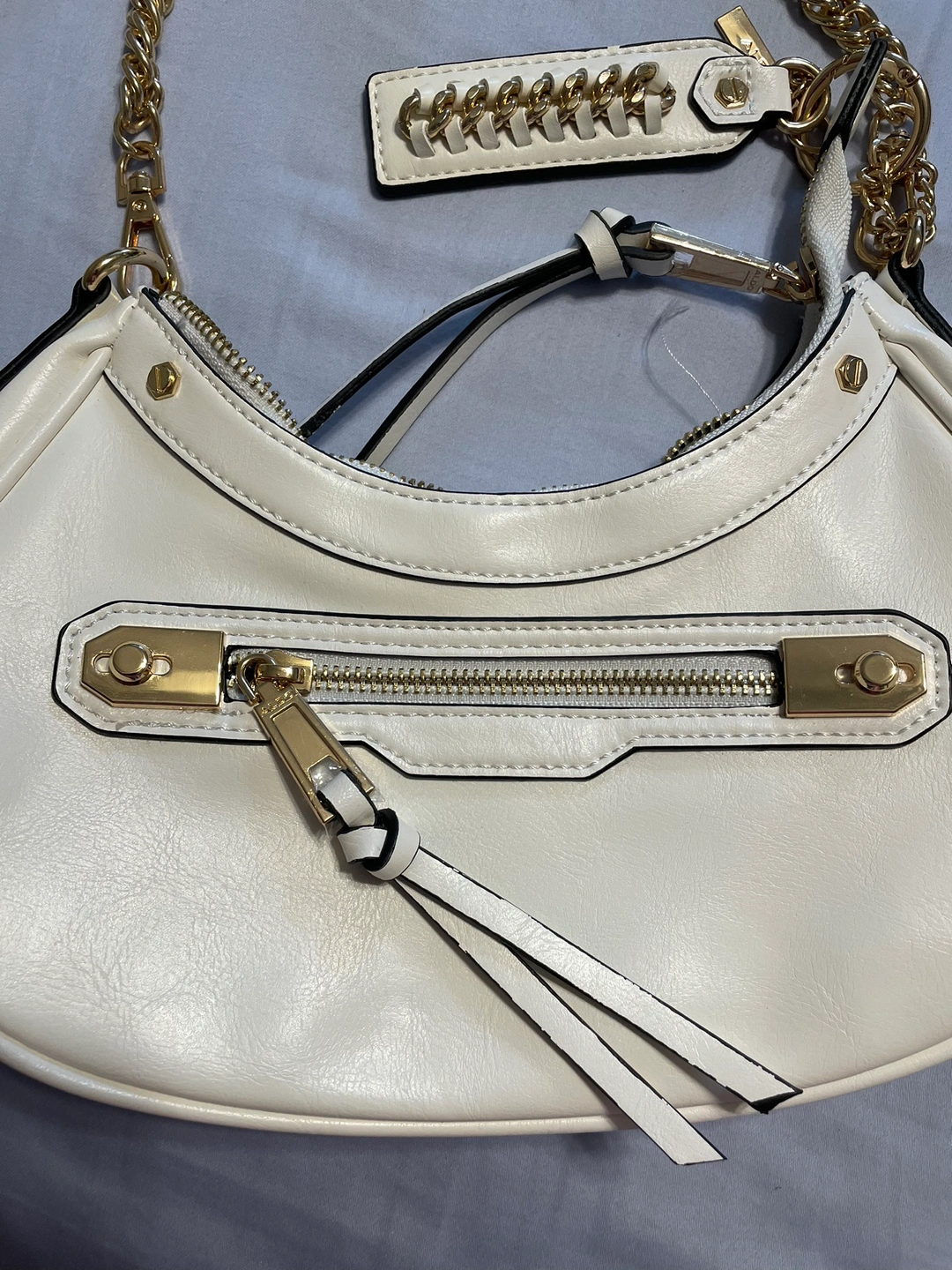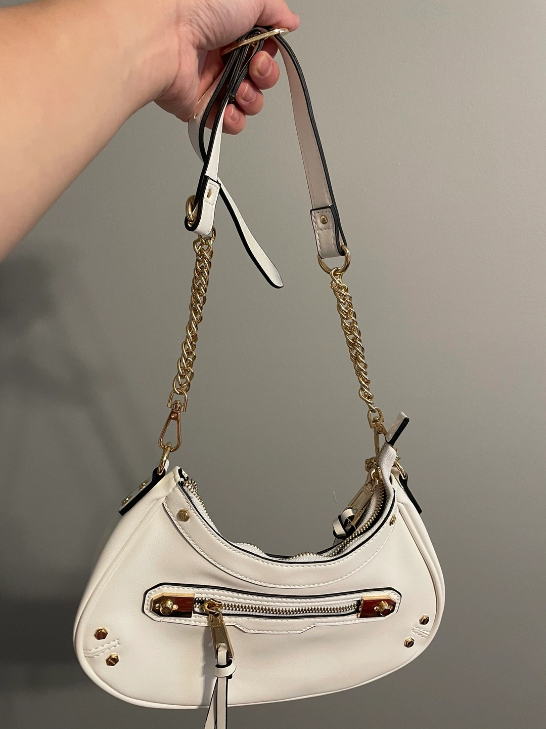 Small white handbag with gold accents. A chain strap with a second shorter strap. The bag has a zipper closure with a tassel detail. The interior is lined with black fabric and features a small pocket.