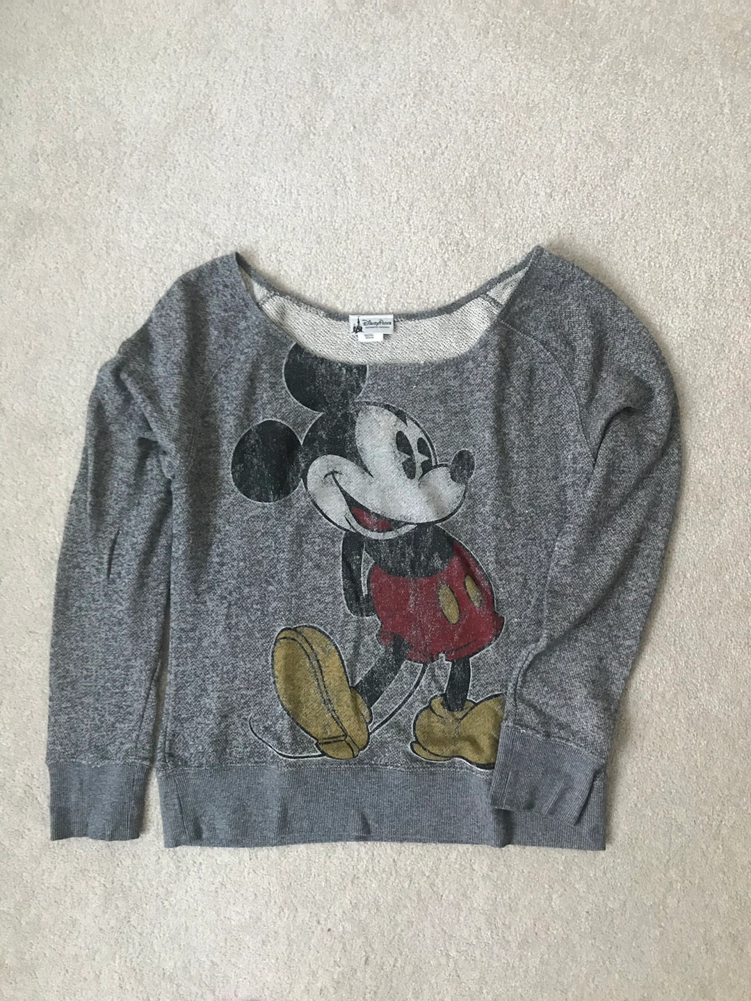 Grey long sleeve sweatshirt featuring a large Mickey Mouse graphic. The sweatshirt has a relaxed fit and a round neckline. Pick up only, Wilson Heights and Sheppard area From a smoke-free and pet-free home Cross-posted