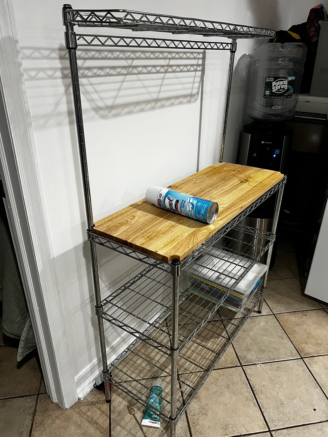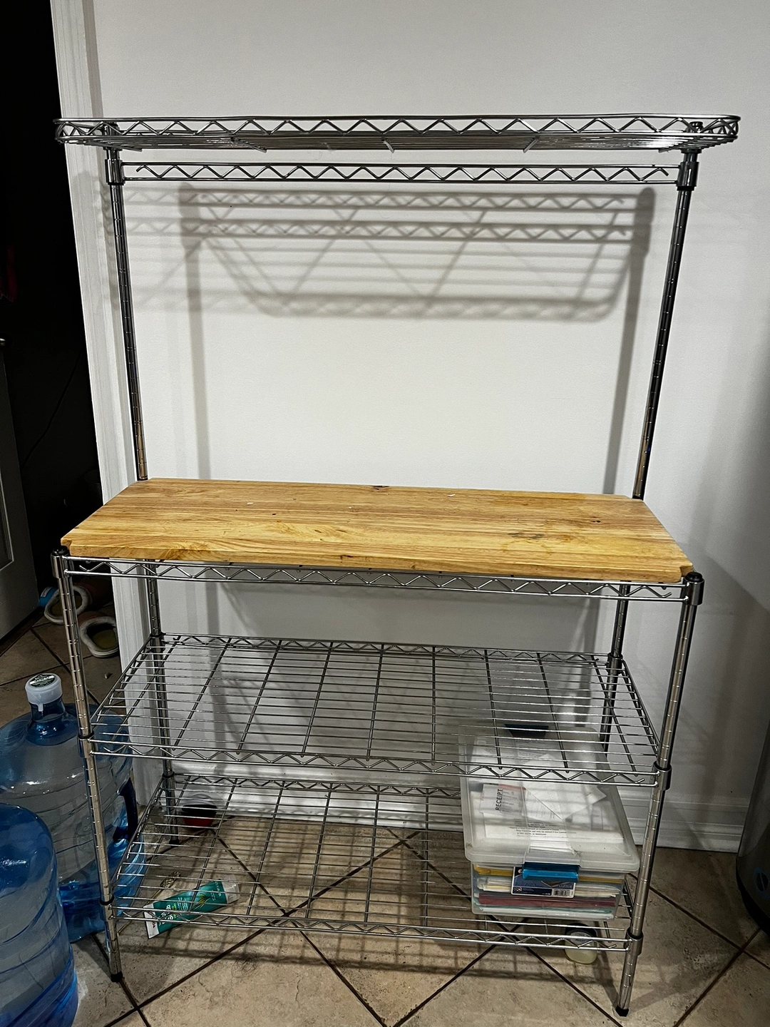 This baker's rack is made of metal with a removable wood top. It has 3 shelves. Great for small apartments. Price is negotiable.