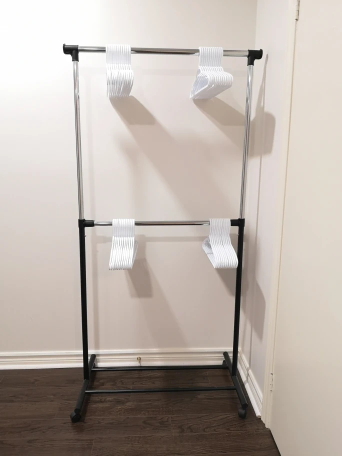 A freestanding two-tiered garment rack / clothes organizer with smooth rolling wheels for easy mobility and an expandable top hanging bar. The rack is black with chrome bars. Includes 4 dozens of hangers. It can be used to organize clothes in a bedroom, closet, laundry room or other area. The rack is in good condition.