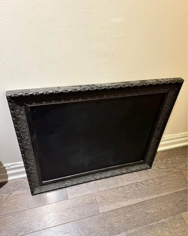 Large chalkboard with an ornate black frame. It can be used as a decorative piece in a home or as a practical message board.
