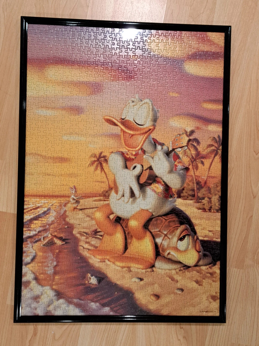 570Completed 1000-piece framed jigsaw puzzle. Features Donald Duck on a turtle at sunset. Beautiful colours. Perfect for Disney fans.