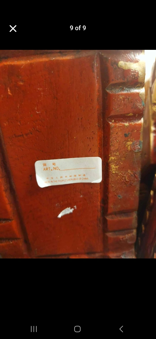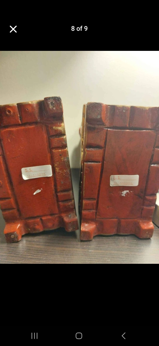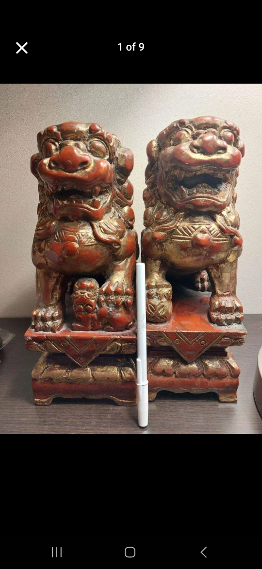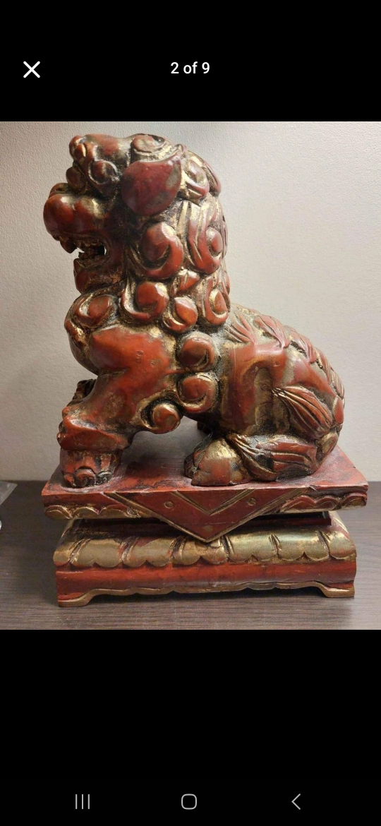 These Foo Dogs are in excellent condition. They are intricately carved and painted. They are made of wood and have a beautiful red and gold finish. They are a great addition to any home decor or collection. The approximate measurements are 13 inches tall and 6.5 inches wide. They are sold as a pair.