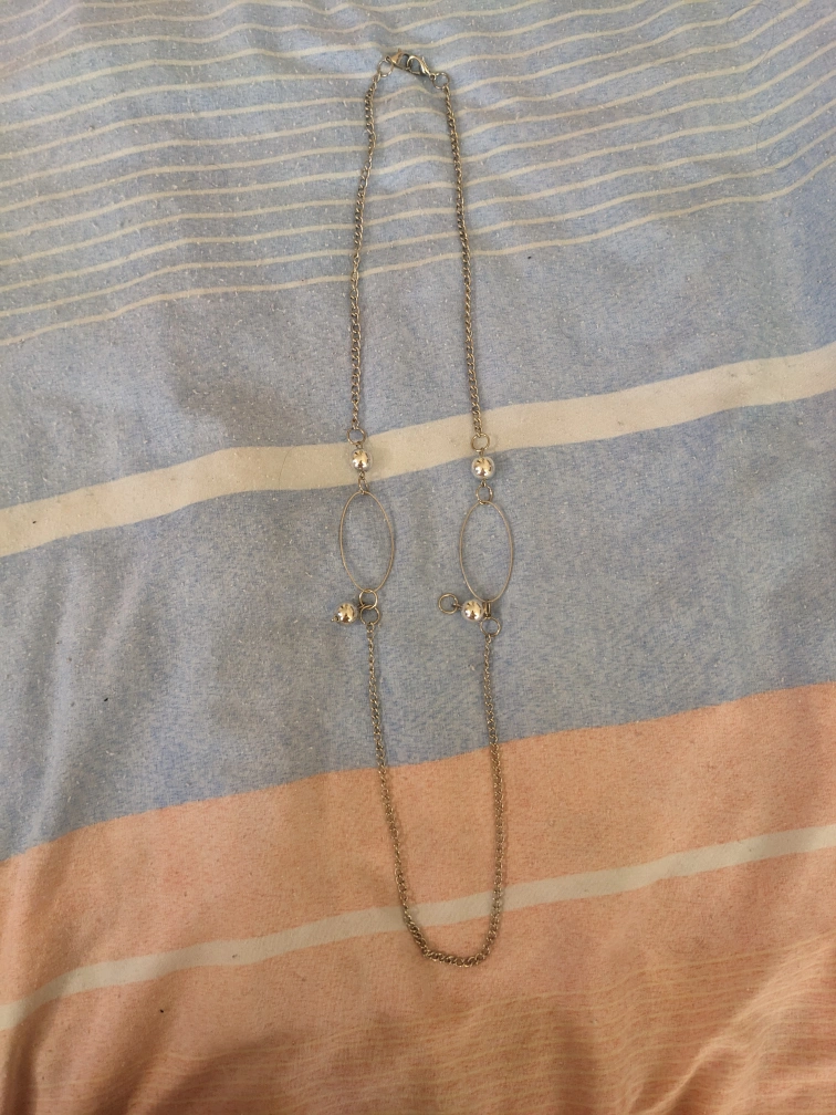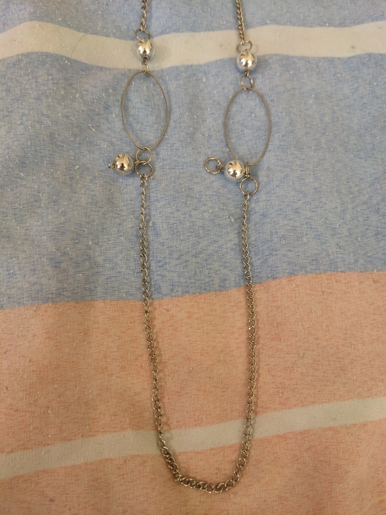 A silver tone chain necklace with two dangling oval shapes and balls. The chain is long, 15" in length when closed on the last loop. The necklace has a lobster clasp closure.