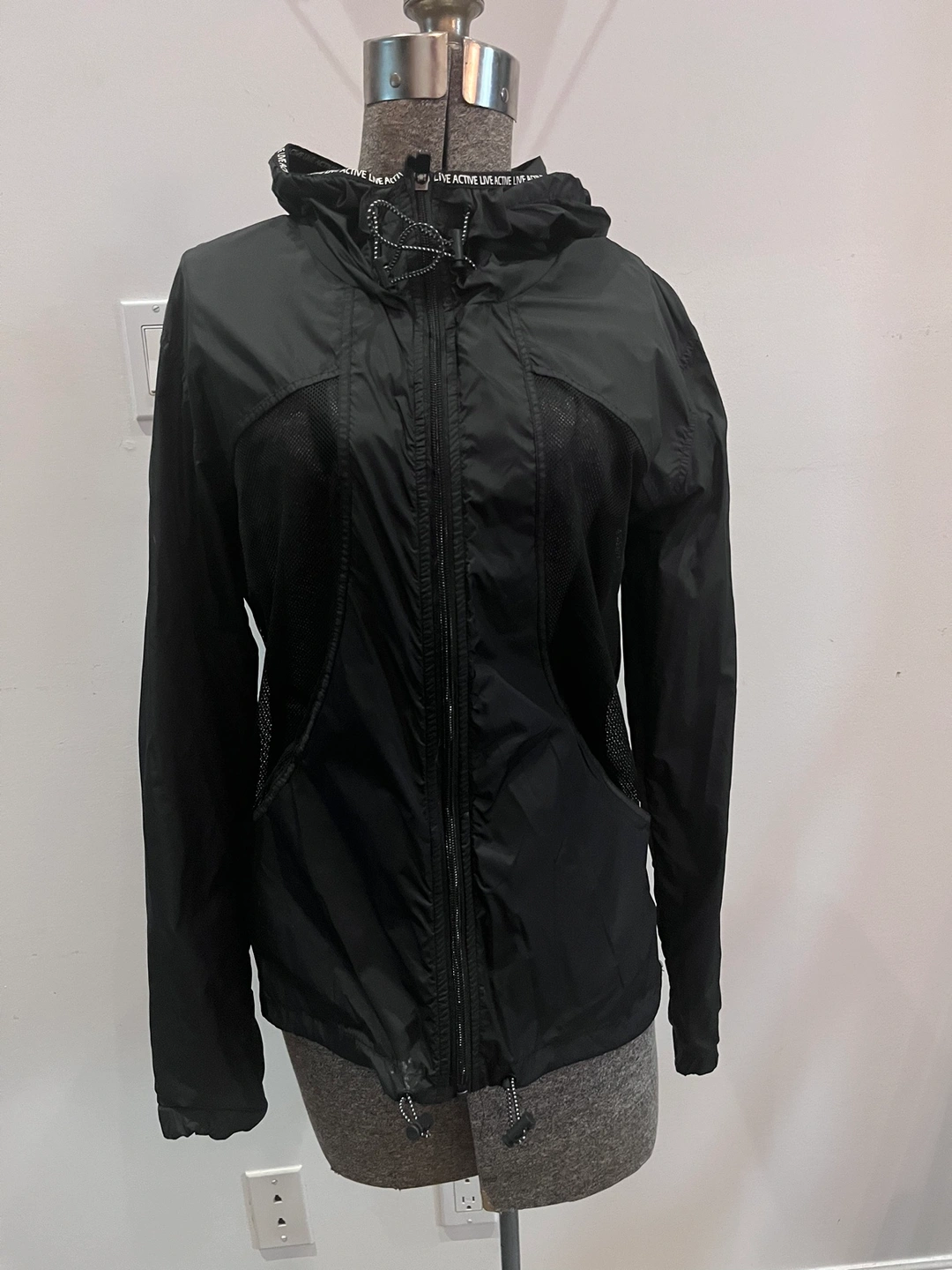 Lightweight black running jacket with mesh panels and a hood. It has a full zip closure, two zippered pockets, and an elastic waistband. The jacket has a "Live Active" logo on the hood.