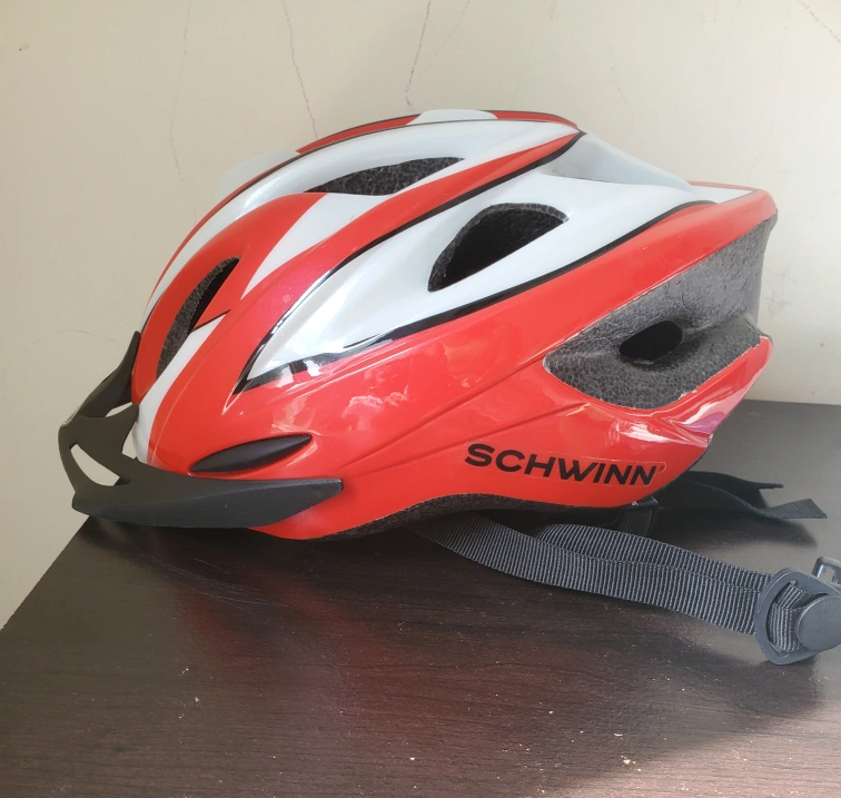 Red and white bike helmet. It has a black strap and buckle. It has vents on the top and sides. It is in good condition.