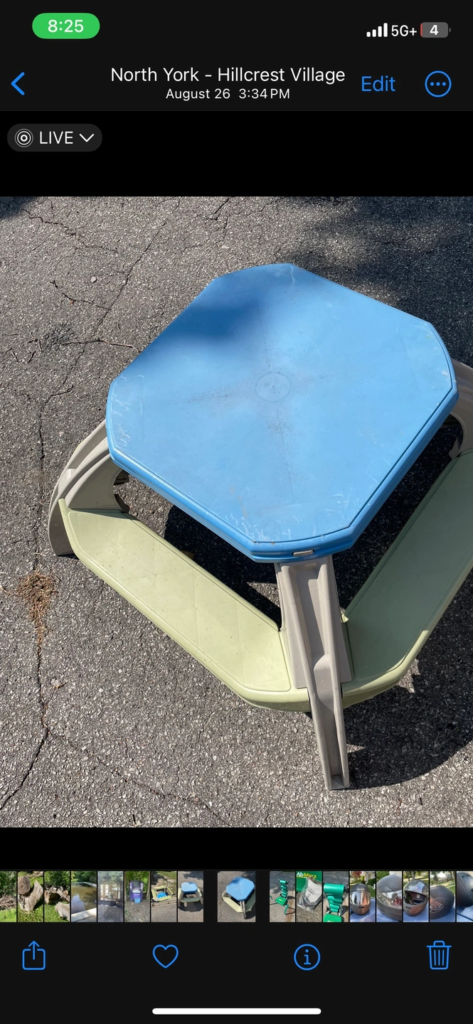 228Plastic picnic table with a blue top and green benches. Avail for pick up at Don mills steee east area. All sales are final