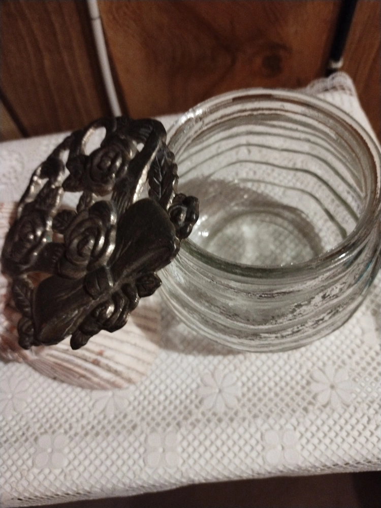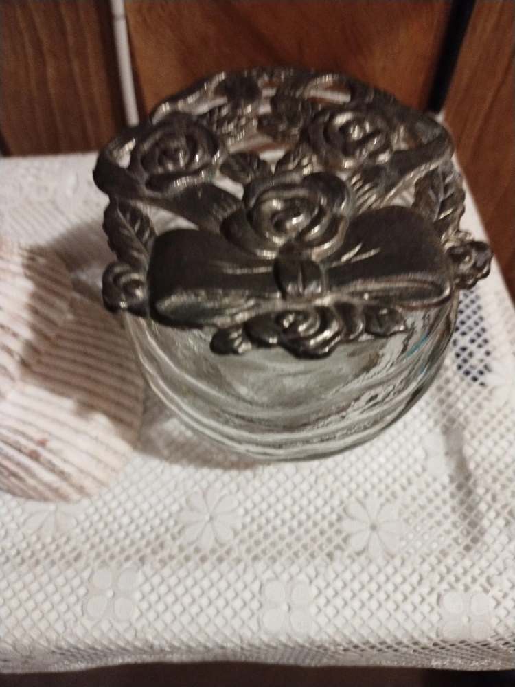 A glass jar with a metal lid with a rose design. The jar is clear glass and has a slightly rippled design. The lid is made of metal and features a design of roses and a bow.