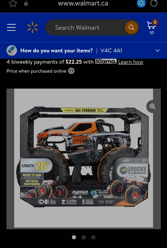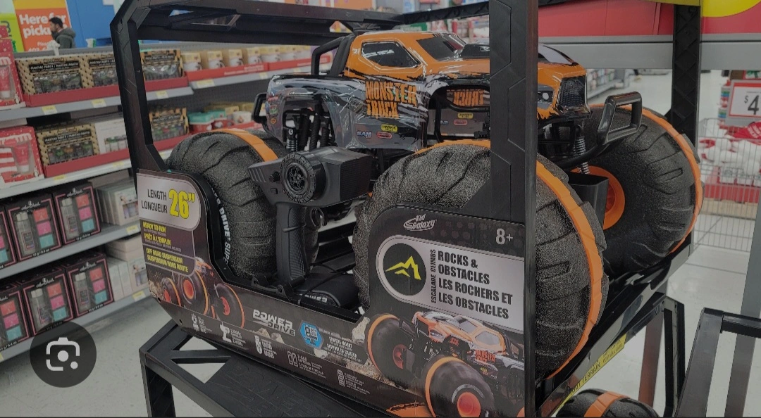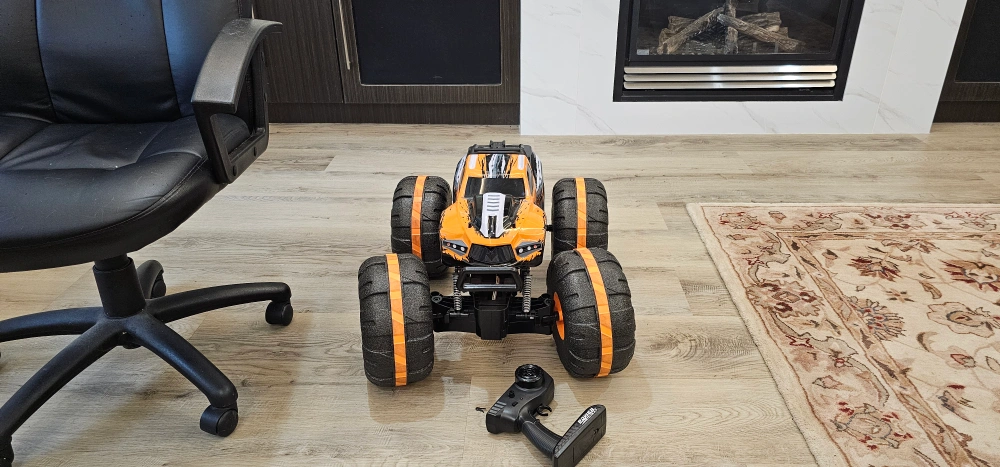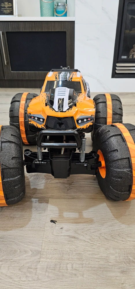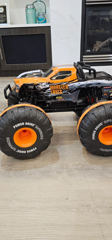 Big remote controlled monster truck with large orange tires and a black and orange body. Got for my son's birthday but he doesn't want it. Brand new condition.