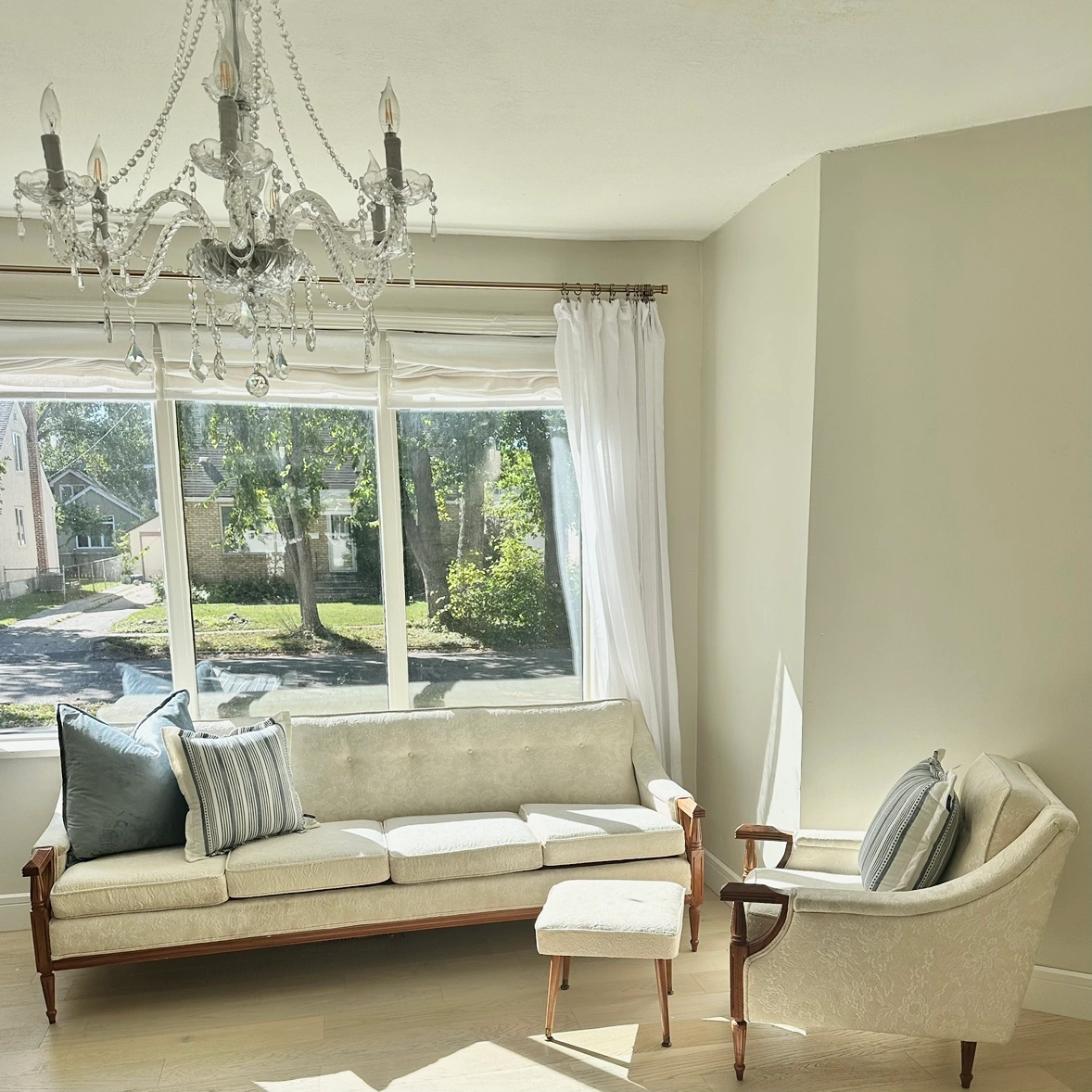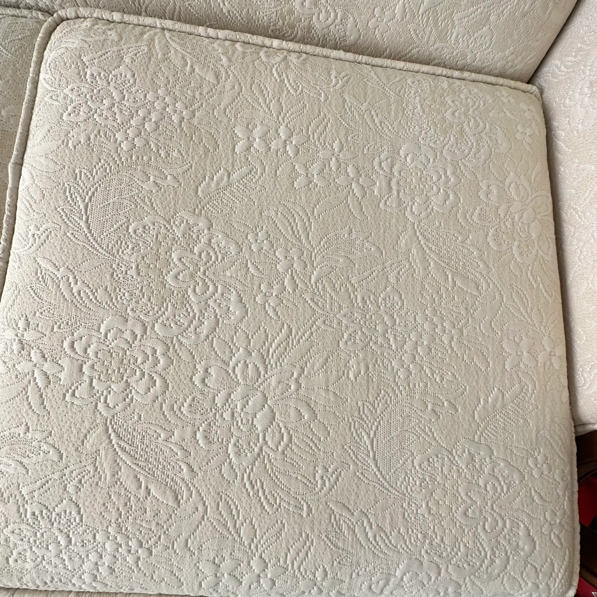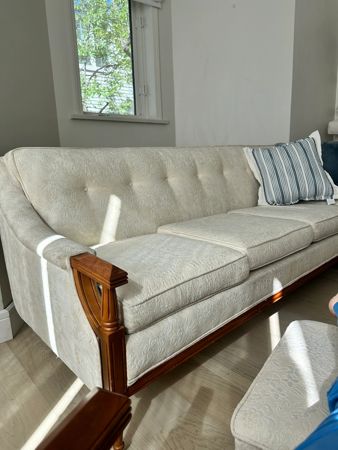 Im obsessed with my french formal looking bench constructed couch. Quality made vintage elegant couch. The ivory fabric has a floral pattern to it. But Im moving soon and cant take it with me