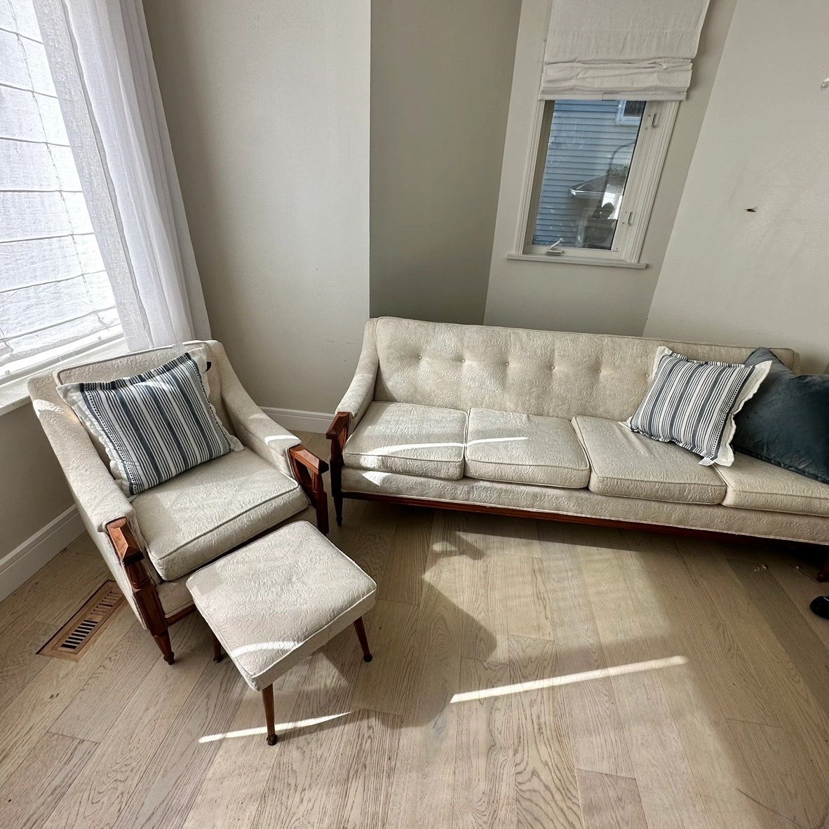 Set of Ivory White 4-seat sofa and armchair with ottoman - vintage elegant traditional - swoop arm. Price includes both