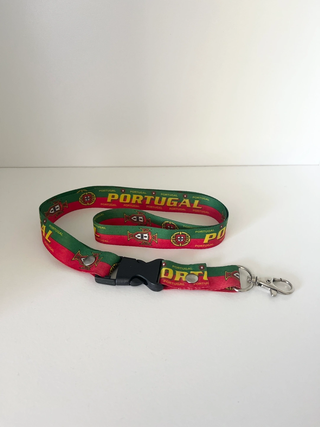 This is a red, green, and yellow lanyard with the word Portugal and the Portuguese crest repeated along the length of it. It has a black plastic clip and a silver hook. Have no use for a lanyard so hoping it can find a new home!