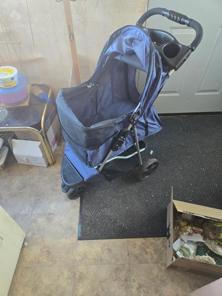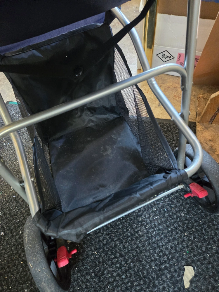 A blue pet stroller that folds up. It has cup holders, a storage basket on the bottom, and a zippered pocket on the back. The mesh windows allow ventilation and visibility. It has a handle for pushing. The stroller is in good condition with normal signs of use.