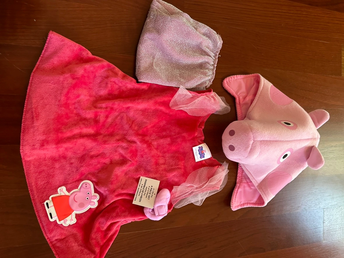 Peppa Pig costume includes red peppa pig shirt, peppa pig hat, sparkling pink shorts, and pink pig tail.